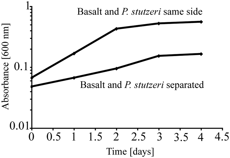 Diffusion chamber experiments demonstrating growth of P. stutzeri VS-10 on Chelex-treated minimal glycerol medium in direct contact with and physically separated from basalt.