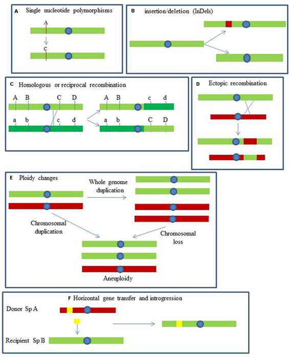 Yeast genomes are exposed to dynamic mechanisms generating genetic polymorphisms with different evolutionary consequences. These mechanisms can be classified in single nucleotide polymorphisms (SNPs), short sequence insertions or deletions, recombination and gene conversion, short tandem duplications, gene and segmental duplications, gross chromosomal rearrangements (GCRs), ploidy changes and interspecific hybridization (Figure 1).