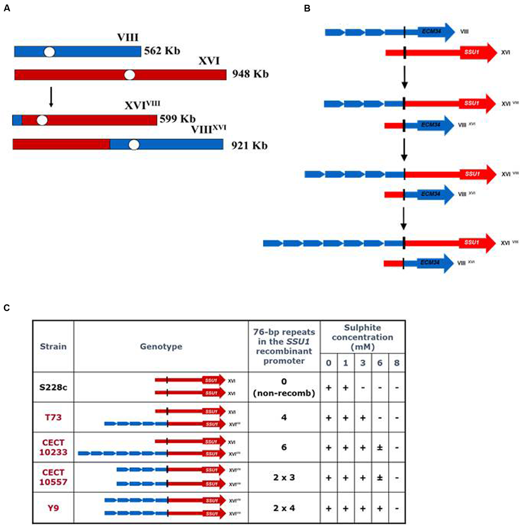 Pérez-Ortín et al. (2002) demonstrated that the translocation between S. cerevisiae chromosomes VIII and XVI, found frequently in wine strains, was generated by an ectopic recombination between genes ECM34, a gene of unknown function, and SSU1, a gene encoding a sulfite pump, and resulted in a chimerical gene that confers greater resistance to sulfite, a preservative used during winemaking (Figure 2A). This recombination resulted in a new SSU1 promoter that contained four repeats of a 76-bp sequence with putative binding sites for the transcription activator Fzf1p (Figure 2B). This translocation produced an enhanced expression for SSU1. These authors reported a perfect association between the sulfite resistance and the number of 76-bp repeated regions in the SSU1 promoter (Figure 2C). In a recent QTL analysis study (Zimmer et al., 2014), another translocation between chromosomes XV and XVI has been related with a higher SSU1 expression. This translocation is due to an ectopic recombination between the promoter regions of the genes ADH1 and SSU1, and also produces an increase in the expression of SSU1 during the first hours of alcoholic fermentation.