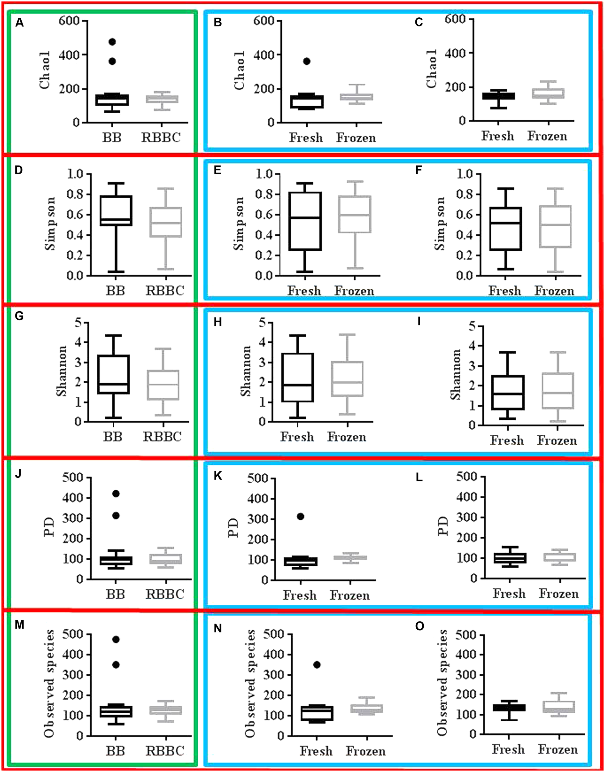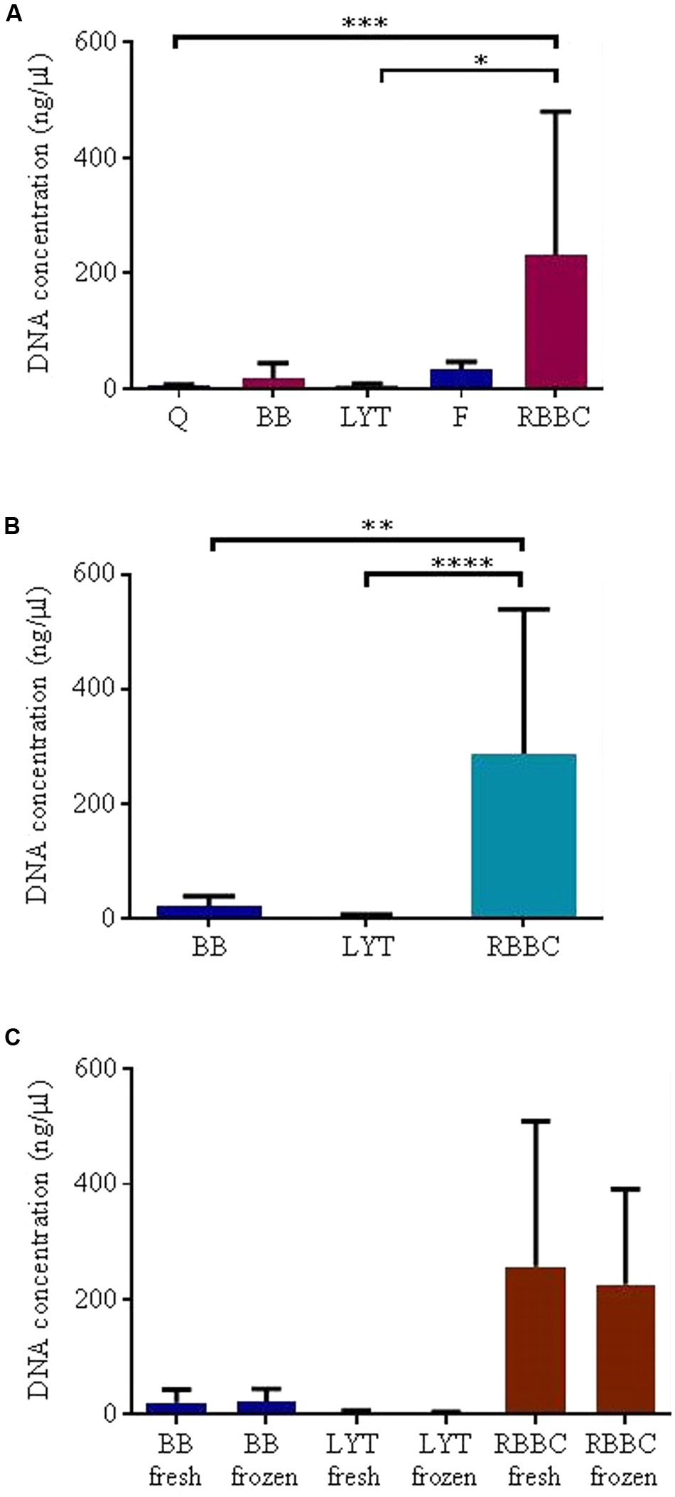 Briefly, 200 mg of feces used for each extraction method. Where tubes for bead beating were required they were prepared by adding 250 mg of equal quantities of 0.1 mm and 1.0 zirconium/silica beads and one 2.3 mm zirconium/silica bead. Extracted DNA was quantified and quality checked using the Qubit® 2.0 Fluorometer and associated kits (the Qubit® dsDNA HS Assay Kit, Qubit HS RNA assay kit and Qubit protein assay kit) as well as DNA visualization on stained agarose gels (1% agarose gel stained with SYBR® Safe DNA Gel Stain) and visualized under UV light. Two methods were excluded (F and Q) due to the results obtained from Qubit assays’ and the inability to produce PCR products from DNA extracted using these methods. A further twelve fresh fecal samples were extracted using the remaining three extraction methods (BB, LYT, RBBC). Four samples were also extracted post storage at -80°C using these three extraction methods.