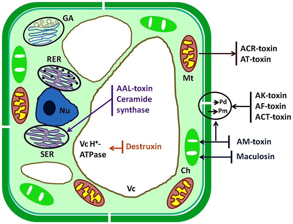 Schematic diagram of target sites of HSTs produced by Alternaria species. Ch, chloroplast; ER, endoplasmic reticulum; GA, Golgi apparatus; Mt, mitochondrion; Nu, nucleus; Pd, plasmodesma; Pm, plasma membrane; Vc, vacuole.