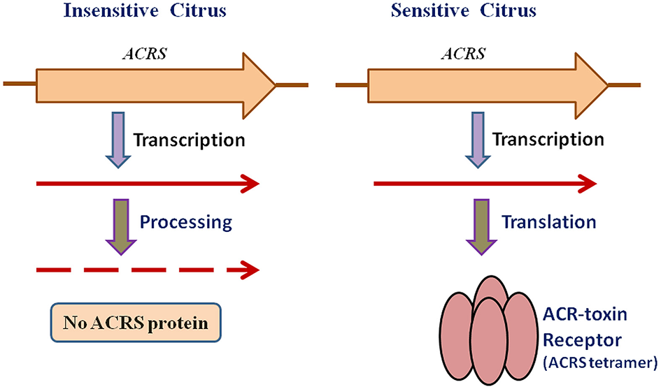 To investigate the relationship of ACRS to sensitivity to ACR-toxin and hence susceptibility to A. alternata rough lemon pathotype, Ohtani et al. (2002) sequenced this region of the mitochondrial genome from resistant cultivars and 13 species of citrus and found that the regions in the resistant citrus are identical to that of rough lemon (Ohtani et al., 2002). However, examination of ACRS transcripts demonstrated that sensitivity to the toxin is not controlled by the presence or absence of ACRS but rather by post-transcriptional modification of the ACRS transcripts (Figure 3). The peptide encoded by ACRS was detected by immunoblotting only in rough lemon mitochondria, but not in toxin-insensitive citrus mitochondria, and the peptide appeared to consist of sodium dodecyl sulfate (SDS)-resistant oligomers that have been reported for many pore-forming transmembrane proteins (Figure 3; Ohtani et al., 2002).