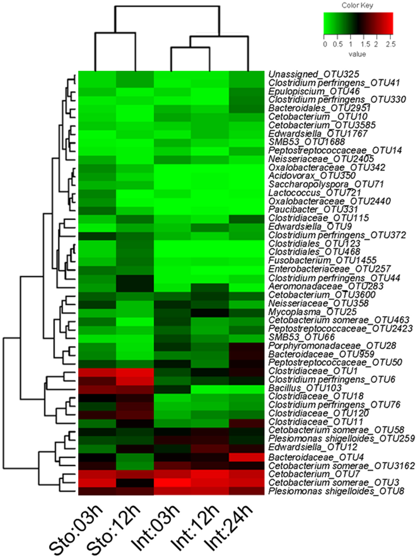 Stomach community at 03h after feeding was clearly divided from that at 12h by the lower abundance of Firmicutes (on average, 39.91 vs. 70.95%) and higher Fusobacteria (44.62 vs. 15.18%) (Figure S5A). The phyla were the two largest contributors (44.25 and 41.68%) to the overall dissimilarity (38.98%) (SIMPER, Table S3). The intestine microbiota at 03 and 12h after feeding had less overall dissimilarity (13.87%), which increased between groups over time (Table S3). The abundance of Fusobacteria and Proteobacteria significantly decreased at 24h after feeding (Figure S5A). Of note, Bacteroidetes in the intestine at 03h dramatically increased from 3.94 to 28.38% at 24h after feeding, resulting in the largest contribution (34.66%) to the overall dissimilarity (SIMPER, Table S3). Similarly, conspicuous differences were also detectable at genus levels (Figure S5B). The genus Cetobacterium significantly decreased from 44.48% at 03h to 14.69% at 12h after feeding in the stomach (Student's t-test, P = 0.027), and from 65.51% at 03h to 44.02% at 24h in the intestine (one-way ANOVA, P = 0.014), whereas unclassified Clostridiaceae increased from 23.03 to 35.76% in the stomach (Student's t-test, P = 0.027) and from 1.5 to 7.84% in the intestine (one-way ANOVA, P = 0.016) (Table S2). Clostridium increased from 7.08 to 26.55% in the stomach (Student's t-test, P = 0.001) and unclassified Bacteroidaceae decreased from 2.63 to 25.18% in the intestine during digestion (one-way ANOVA, P = 0.007) (Table S2). In addition, most dominant OTUs in the stomach and intestine changed significantly after feeding (Figure 4).
