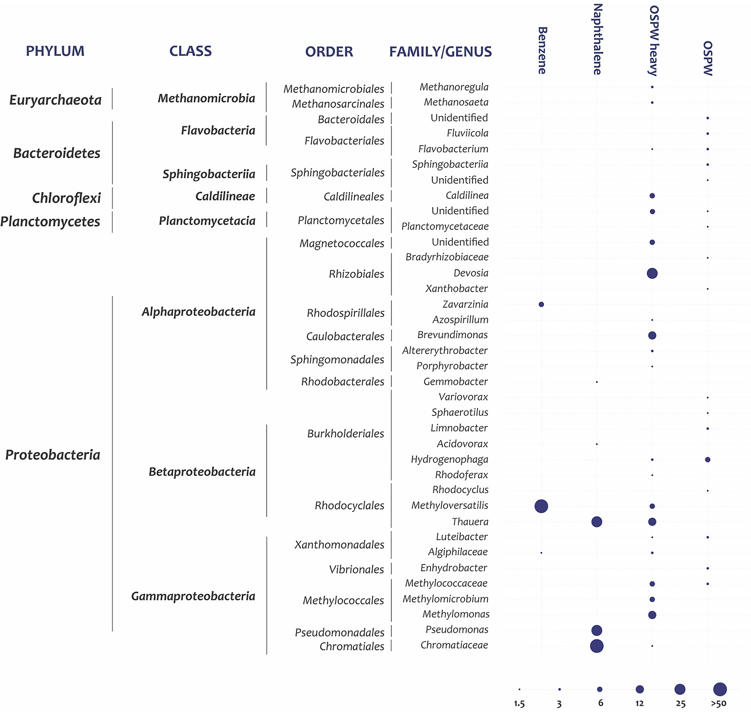 Predominant taxa detected in DNA of control OSPW samples, and in heavy DNA fractions extracted after incubation with 13C benzene or 13C naphthalene. Data are relative abundances of taxa within sequenced 16S rRNA gene amplicons (only OTUs >1% of the total reads are shown). The lowest taxonomic level confidently assigned is based on 16S rRNA identity thresholds defined by Yarza et al. (2014). Phylum, class, order, and either family or genus is indicated. Benzene: heavy-DNA fraction of benzene-amended OSPW incubated for 9 days; Naphthalene: heavy-DNA fraction of naphthalene- amended OSPW incubated for 7 days; OSPW-heavy: heavy fraction of OSPW incubated for the same amount of time as the amended samples; and OSPW-control: complete, unfractionated DNA from OSPW. The bubbles show 6 abundance classes (1–1.75%; 1.76–4.5%; 4.6–9%; 9.1–18.5%; 18.6–37.5%; >37.6%).