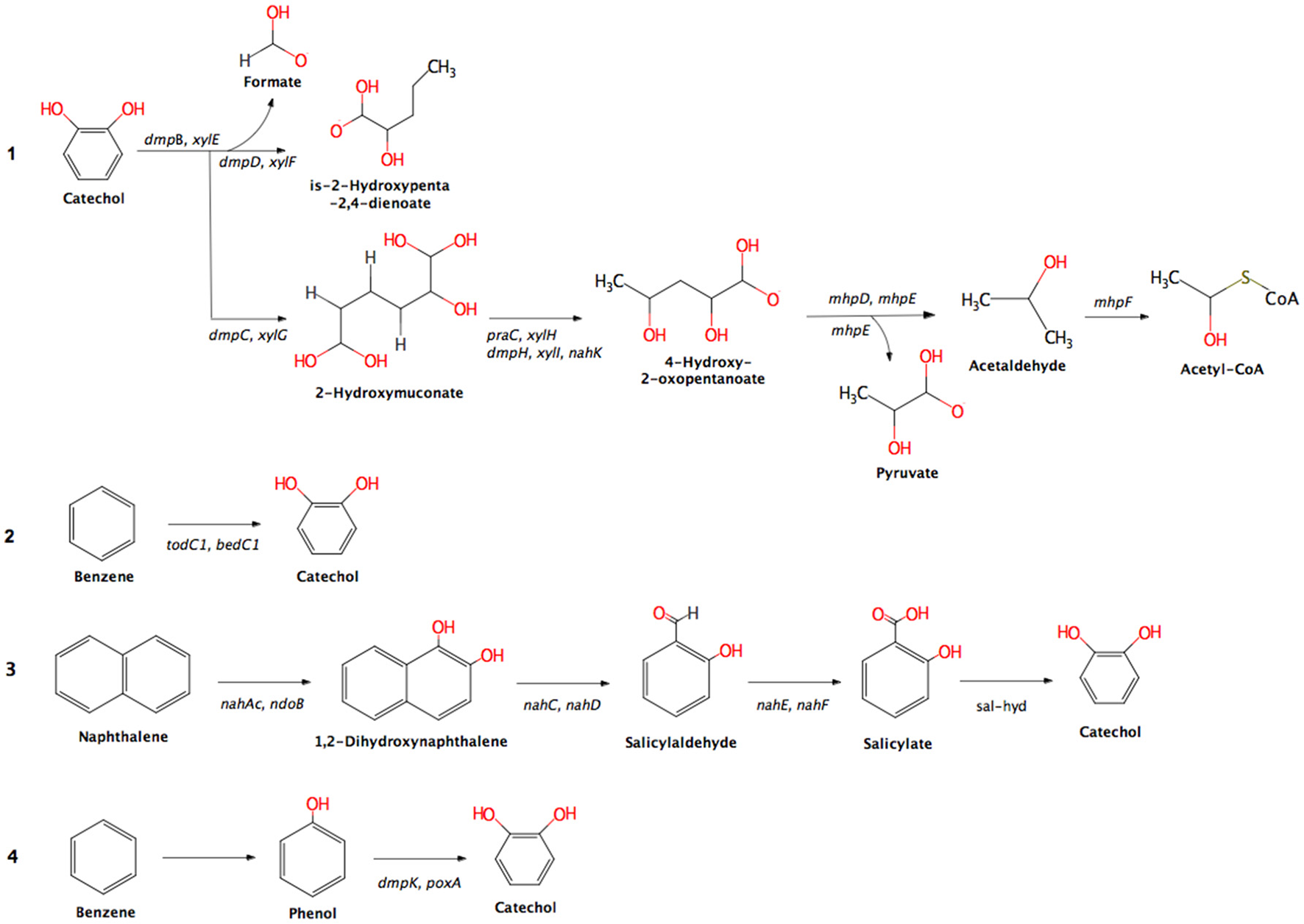 Detected pathways (substrates) for aerobic hydrocarbon metabolism in the OSPW metagenome and their associated genes. Pathway descriptions: 1, meta-cleavage of catechol; 2, dioxygenase and dehydrogenase reactions; 3, ring removal from polycyclic aromatic ring; and 4, two monooxygenase reactions. Enzyme names abbreviations and their synonyms: dmpB, xylE, catechol 2,3-dioxygenase; dmpD, xylF, hydroxymuconate-semialdehyde hydrolase; dmpC, xylG, aminomuconate-semialdehyde/2-hydroxymuconate-6-semialdehyde dehydrogenase; praC, xylH, oxalocrotonate tautomerase; dmpH, xylI, nahK, 2-oxo-3-hexenedioate decarboxylase; mhpD, 2-keto-4-pentenoate hydratase; mhpE, 4-hydroxy 2-oxovalerate aldolase; mhpF, acetaldehyde dehydrogenase; todC1, bedC1, benzene/toluene dioxygenase; nahAc, ndoB, naphthalene 1,2-dioxygenase; nahC, dihydroxynaphthalene dioxygenase; nahD, hydroxychromene-2-carboxylate isomerase; nahE, trans-o-hydroxybenzylidenepyruvate hydratase-aldolase; nahF, salicylaldehyde dehydrogenase; sal-hyd, salicylate hydroxylase; dmpK, poxA, phenol hydroxylase.