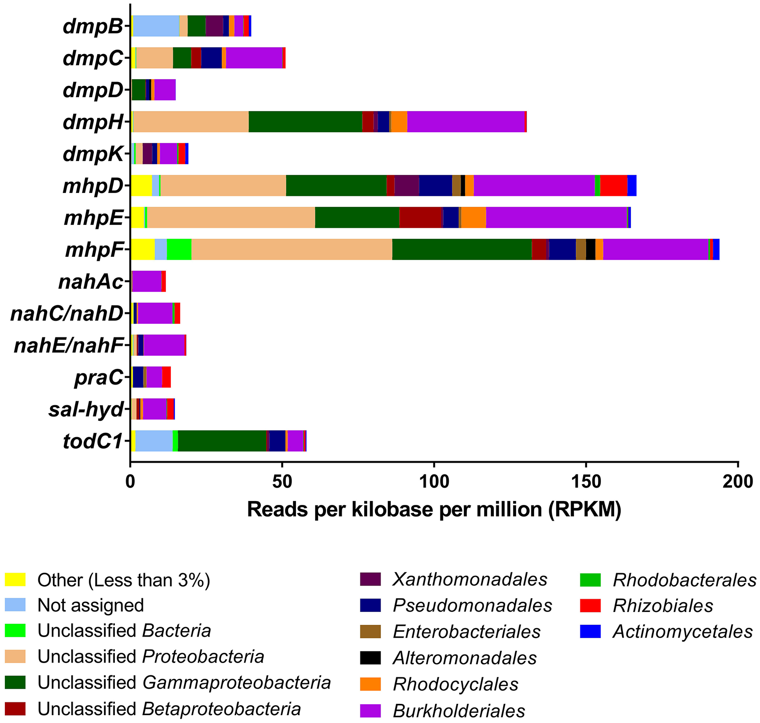 Unassembled metagenomic read distributions of the key genes from Figure 2. Bars represent reads per kilobase per million (RPKM) mapped to the corresponding gene using BLASTN. Taxonomic assignment on recruited reads that exceeded the 1% abundance cut-off was performed with MEGAN to the level of order. “Unclassified” groups include all members of a higher-level taxon that cannot be assigned at a more refined level. “Unassigned” represents reads MEGAN could not assign unambiguously to any taxon. RPKM values of genes nahC and nahD, and nahE and nahF are combined due to their identical functions and low RPKM levels.