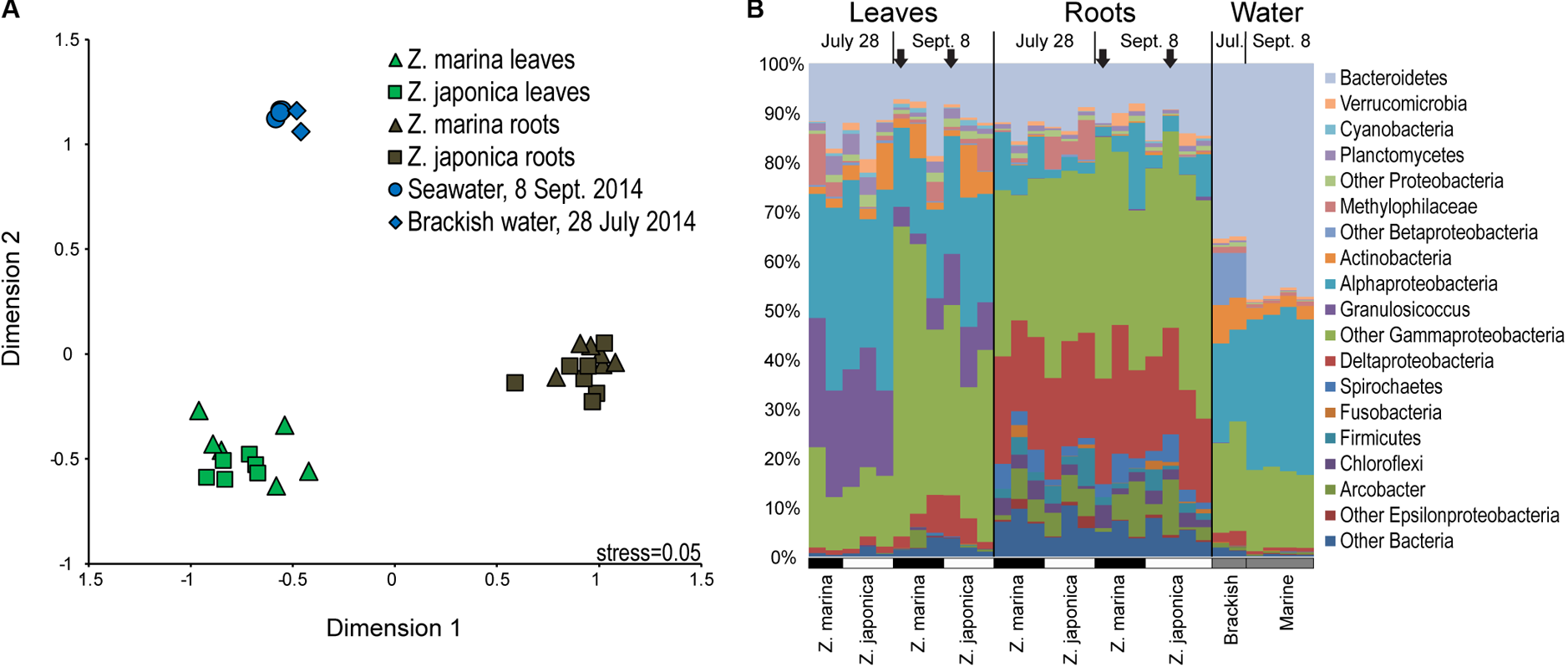 Multidimensional scaling diagram (A) showing beta-diversity of plant-associated and water column bacterial communities based on Bray–Curtis similarity calculated from the relative abundances of 16S rRNA gene amplicon sequences grouped into operational taxonomic units (OTUs) based on 97% DNA sequences similarity. (B) Taxonomic diversity of plant-associated and water-column bacterial communities based on 16S rRNA gene amplicon sequences grouped by major taxa with samples labeled by tissue type, date, and plant species. The black arrows indicate samples used for metatranscriptomics.