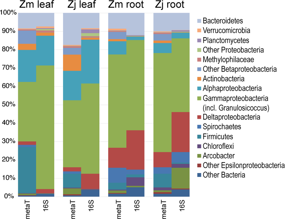 Comparison of the taxonomy of KEGG-annotated genes from metatranscriptomes with 16S rRNA gene amplicon sequences. 16S genes assigned to the genus Granulosicoccus were grouped with Gammaproteobacteria. Transcripts and 16S genes assigned to Cyanobacteria and Fusobacteria were omitted. (Zm: Z. marina; Zj: Z. japonica)