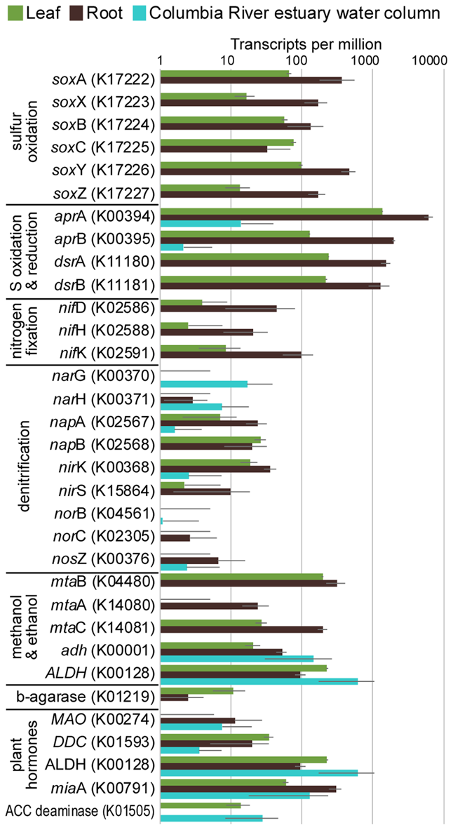 Average transcripts per million (TPM) for select genes from metatranscriptomes of eelgrass leaves and roots, and from the water column of the Columbia River estuary. Error bars indicate standard deviation.
