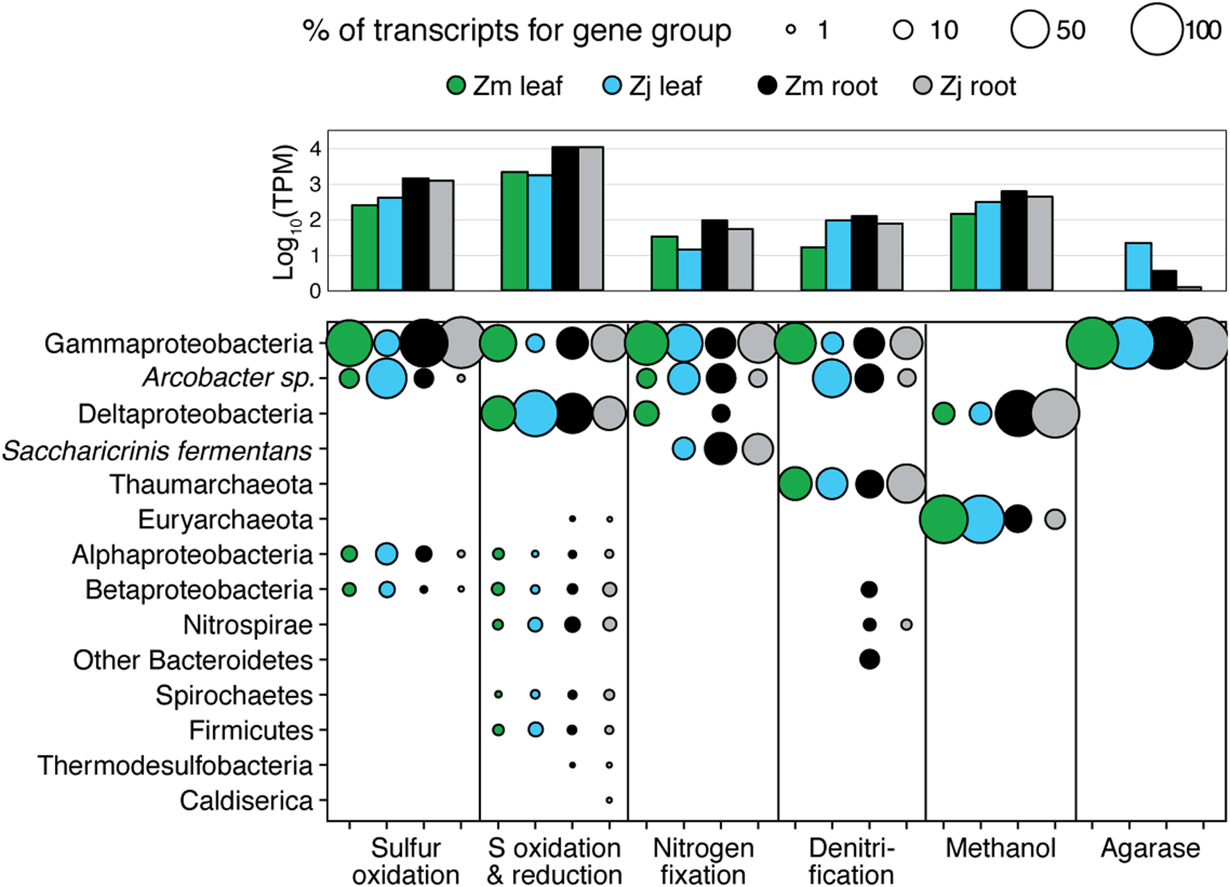 The taxonomic composition of microbial communities based on metratranscriptome sequences was similar to that based on 16S gene amplicon sequences (Figure 3). Transcripts were detected for genes encoding functions potentially involved in plant–microbe mutualisms, including sulfur oxidation, nitrogen fixation, denitrification, methanol and ethanol consumption, beta-agarase production, and plant hormone synthesis (Figure 4). Sulfur oxidation genes on roots and leaves (soxABCXYZ) were expressed by Arcobacter sp., and genes involved in sulfur oxidation and reduction (aprAB, dsrAB) were expressed by both sulfur-oxidizing Gammaproteobacteria and sulfate-reducing Deltaproteobacteria (Figure 5). Nitrogen fixation genes (nifHDK) were primarily expressed by sulfur-oxidizing Gammaproteobacteria, Arcobacter sp., and a known nitrogen-fixing Bacteroidetes. Methanol consumption genes (mtaABC) were expressed primarily by Deltaproteobacteria on roots and by Euryarchaeota on leaves. Denitrification genes were expressed by Gammaproteobacteria, Arcobacter sp., and Thaumarchaeota, and beta-agarase was expressed by Gammaproteobacteria.