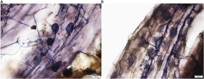 Photomicrographs of structural colonization of arbuscular mycorrhizal fungi in the roots of Elaeagnus angustifolia. (A) Vesicles (V); (B) Arbuscule (AR).