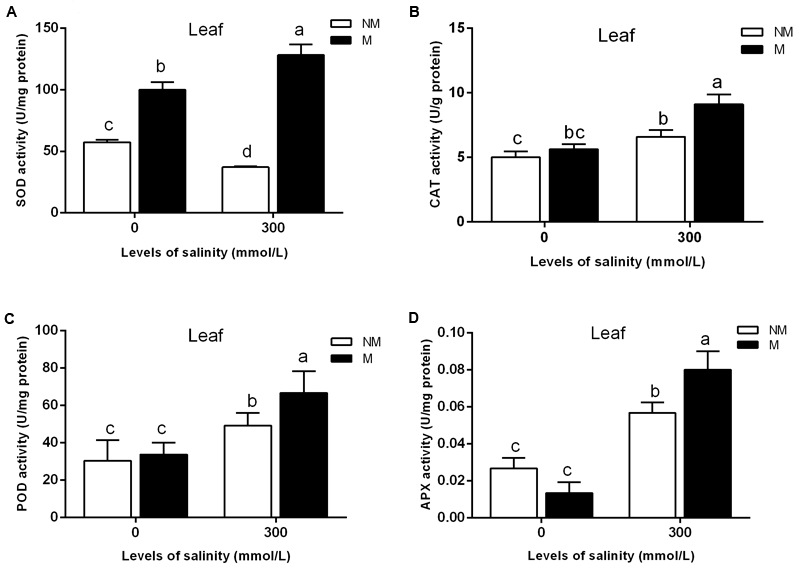 Effects of arbuscular mycorrhizal fungi inoculation on the superoxide dismutase (SOD) (A), catalase (CAT) (B), peroxidase (POD) (C), and ascorbate peroxidase (APX) (D) activities in the leaves during different salt conditions. M, mycorrhizal; NM, non-mycorrhizal; 0 mmol/L, without salt stress; 300 mmol/L, during salt stress. Columns represent the means for three plants (n = 3). Error bars show the standard error. Columns with different letters indicate significant differences between treatments at P < 0.05.
