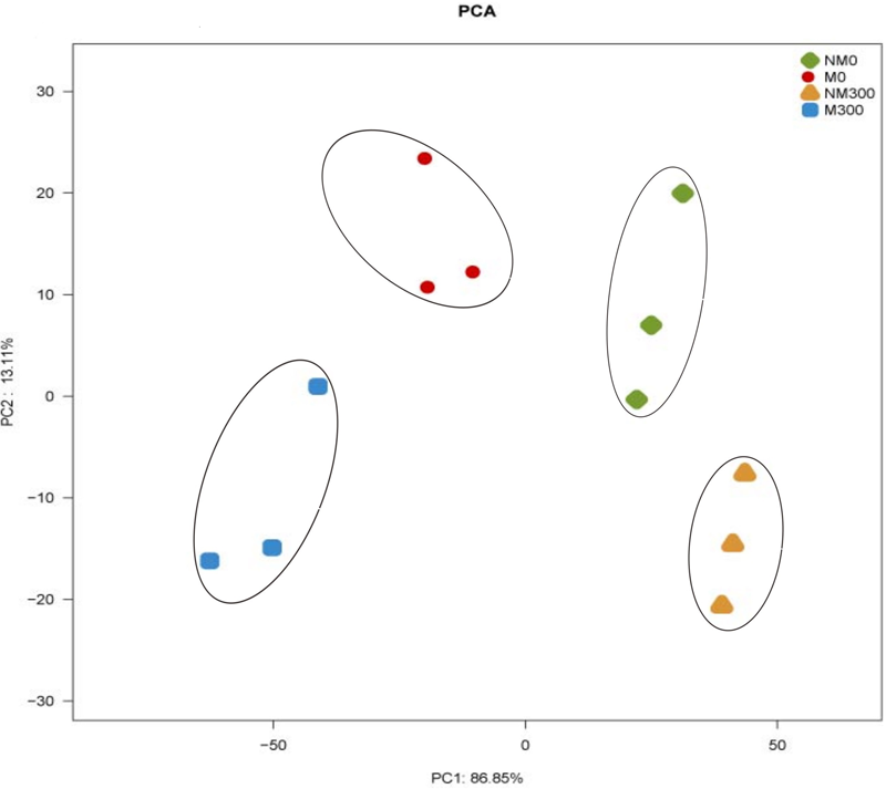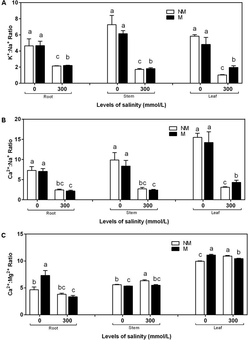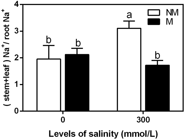 M, mycorrhizal; NM, non-mycorrhizal; 0 mmol/L, without salt stress; 300 mmol/L, during salt stress.