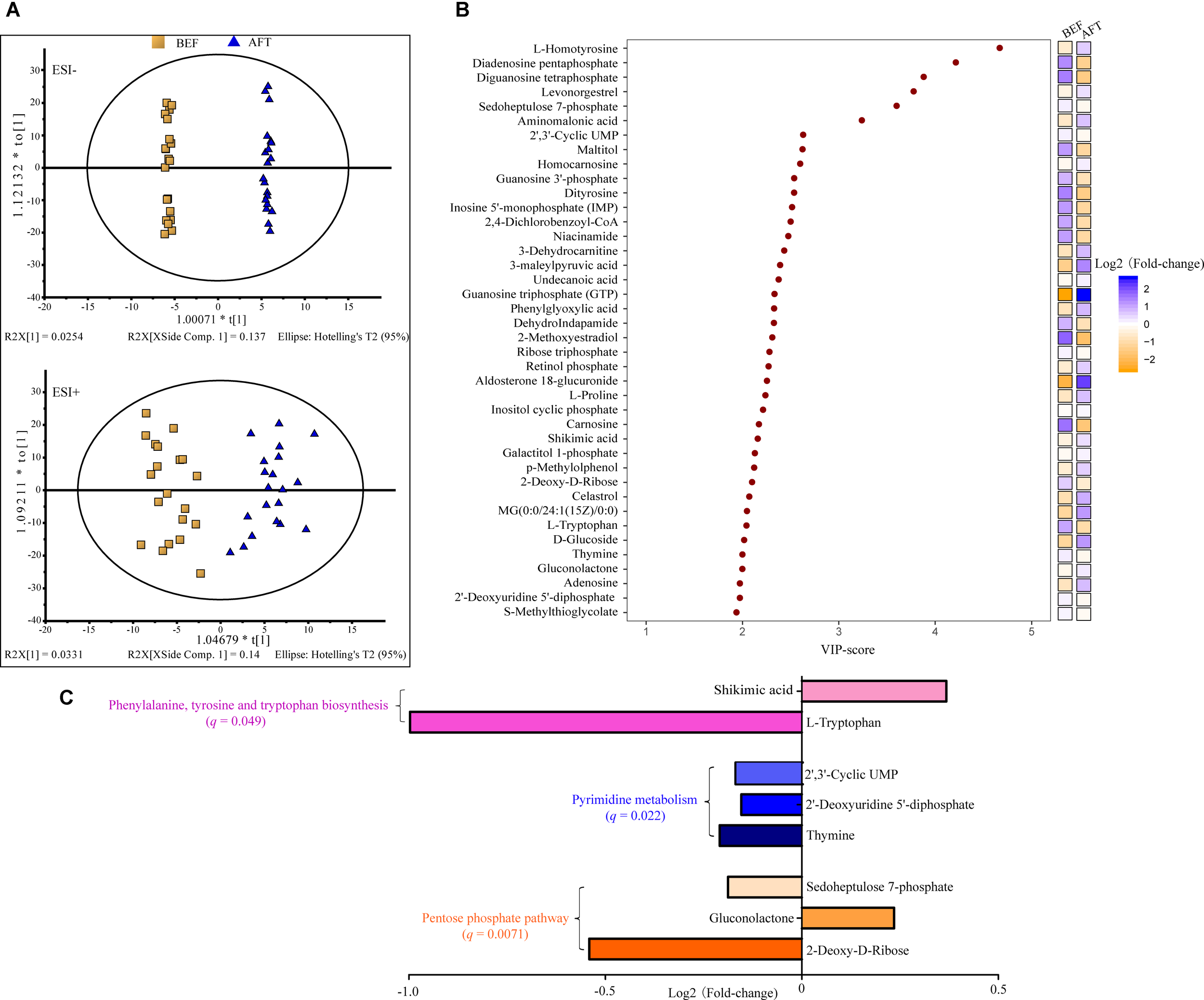 To address the enteric changes, metabolites extracted from feces before and after running were detected using a LC-MS-based metabolomics approach. As shown in Figure 1A, the metabolite concentrations of the BEF and AFT groups were compared using OPLS-DA, which was conducted to maximize the difference between the two groups. The VIP score is an indication of the contribution to the OPLS model (Figure 1B). Overall, 40 metabolites were significantly changed after running, with VIP scores > 1, including 9 nucleic acid components, 8 organic acids, 4 sugars, 3 alcohols, 3 steroids, 3 lipids, 3 amino acids, and 7 other metabolites. Compared to the fecal profile before running, 19 metabolites were decreased with log2 FC (log2 fold-change) less than 0, while 21 metabolites were reduced (log2 FC > 0). Organic acids (7 organic acids) were identified as the major elevated metabolites, while nucleic acid components (7 nucleic acid components) were the highest proportion in the reduced metabolites. L-Homotyrosine (log2FC = 0.6), diadenosine pentaphosphate (log2FC = -1.3), diguanosine tetraphosphate (log2FC = -1.5), levonorgestrel (log2FC = 0.3), and sedoheptulose 7-phosphate (log2FC = -0.2) were the top 5 metabolites that were changed dramatically, with VIP scores greater than 3. In addition, guanosine triphosphate (GTP), which is involved in energy metabolism for several biosynthetic pathways, was remarkably increased by a fold change of 2.6.
