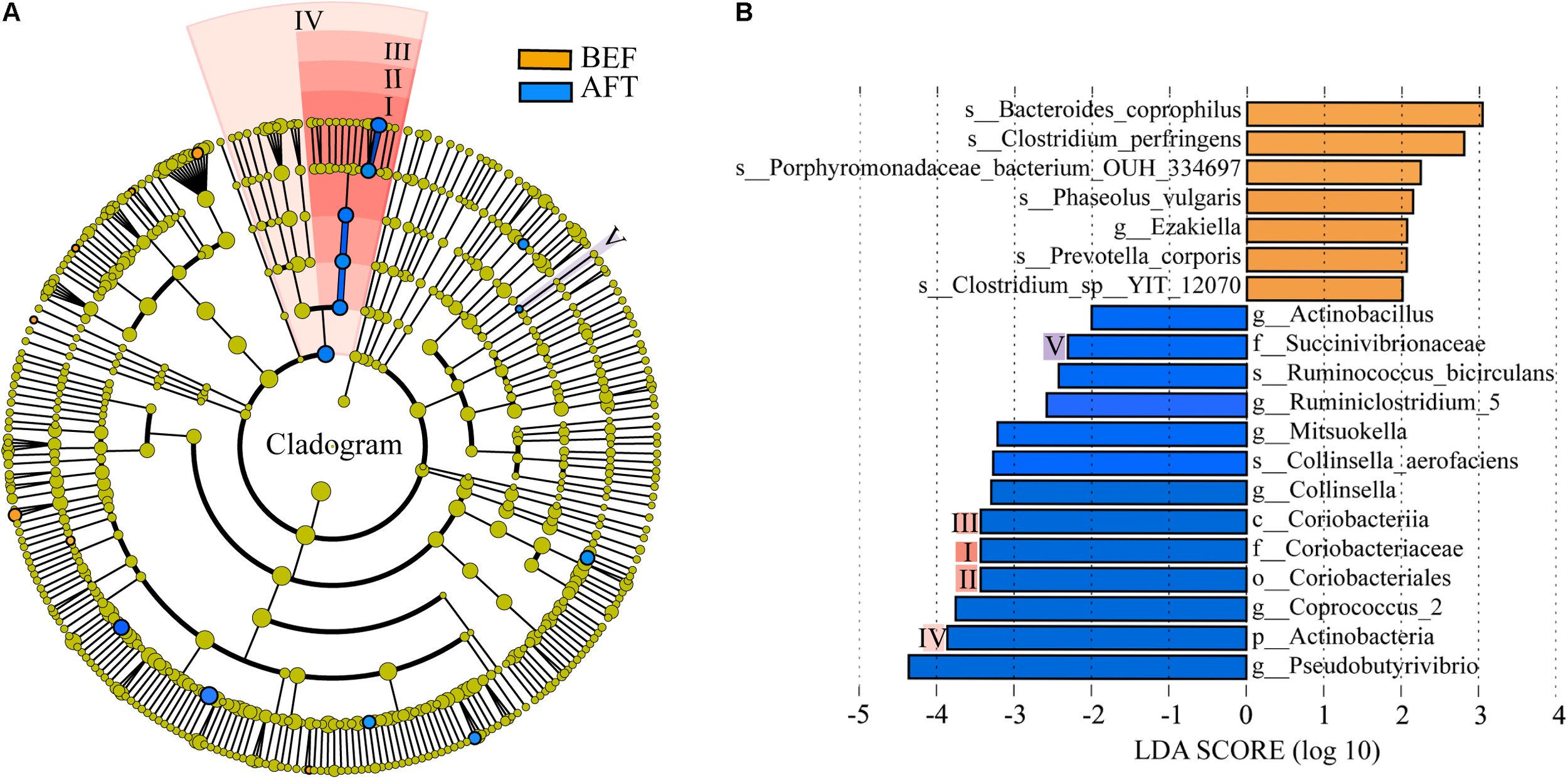 Differentially abundant bacterial taxa between the BFE and AFT groups. (A) Cladogram generated by LEfSe indicating differentially abundant bacterial taxa. (B) LDA scores for the differentially abundant bacterial taxa. Bacterial taxa significantly enriched in the BEF group (LDA score > 2) or AFT group (LDA score < –2) were detected by LEfSe analysis (p < 0.05). (p, phylum; c, class; o, order; f, family; g, genus; s, species).