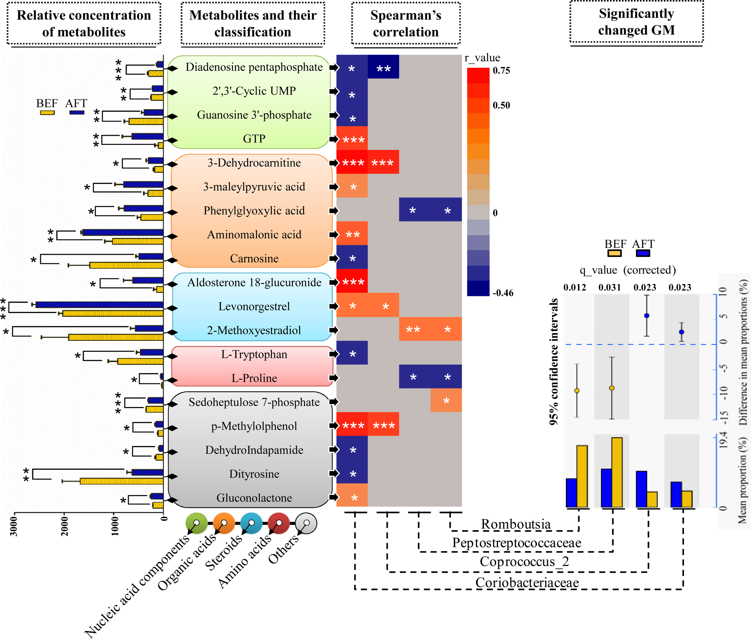 To address the correlations between the differential gut microbiome and the enteric changes, the Spearman correlation coefficient (r) was computed for the 40 differential metabolites and 9 bacterial taxa (the relative abundance was more than 3%) detected by both LEfSe and STAMP analyses (Figure 4). The results showed 26 statistically significant interactions between 19 metabolites and 4 bacterial taxa (p < 0.05). Remarkably, the increase in the bacterial family Coriobacteriaceae after running was shown to correlate with 15 differential metabolites: 4 nucleic acid components, 4 organic acids, 2 steroids, 1 amino acid, and 4 other metabolites. Aldosterone 18-glucuronide, 3-dehydrocarnitine, p-methylolphenol, and guanosine triphosphate (GTP) were found to have strong positive interactions with Coriobacteriaceae (r > 0.5, p < 0.001). It has been documented in previous studies that the Coriobacteriaceae family is involved in bile acid metabolism and that a voluntary wheel running exercise could reduce the proportion of secondary bile acids in feces. However, no significant changes in the detected 16 bile acids (Supplementary Table S2) between before and after running were observed. Another bacterial taxon enriched in the AFT group, the genus Coprococcus_2, was observed to have strong positive interactions with 3-dehydrocarnitine and p-methylolphenol (r > 0.5, p < 0.001). The Peptostreptococcaceae family (phylum Bacteroidetes) and one of its members, the genus Romboutsia, were shown to be weakly related to several metabolites (r < 0.5, p < 0.05).