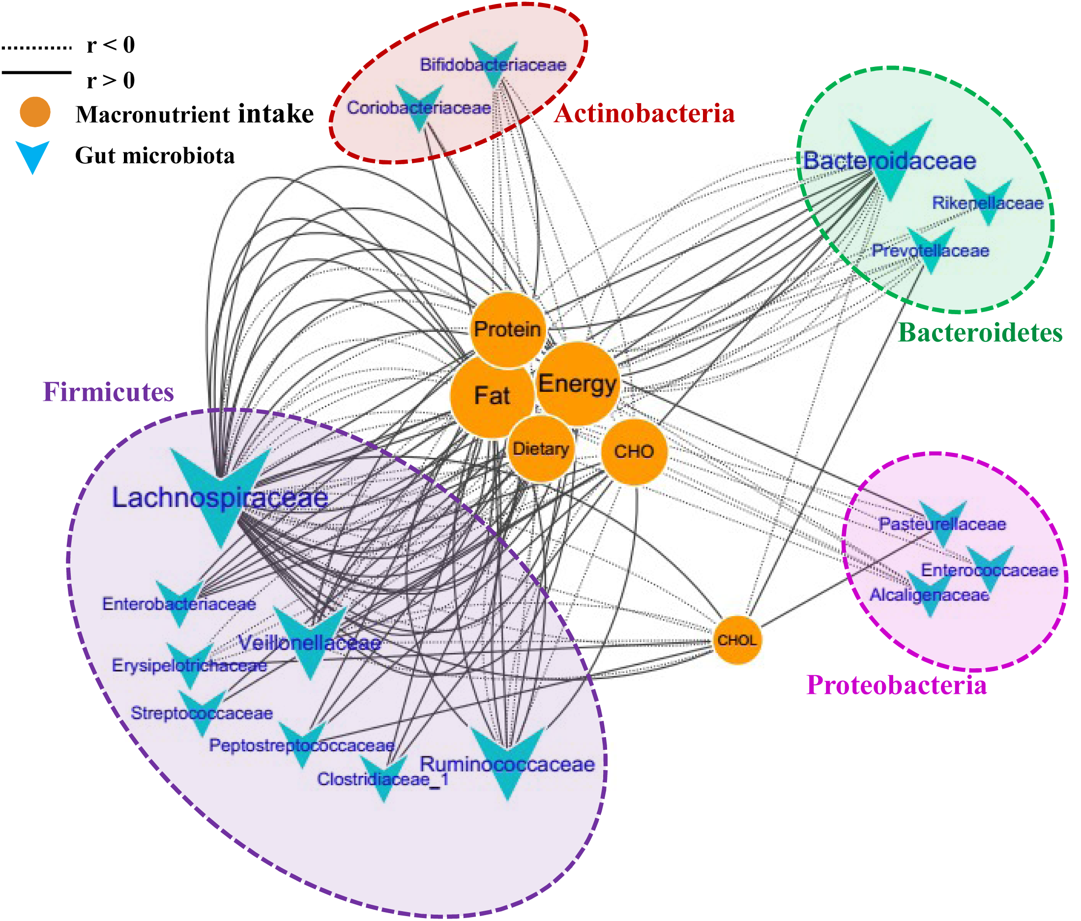 Correlation network of the GM and macronutrient intake. The network consists of 135 edges (significant correlations with p < 0.05) and 22 nodes (bacterial taxa and macronutrient). The bacterial taxa nodes are clustered in four subnetworks (phylum taxa). A solid line shows positive correlations; a dotted line shows negative correlations, and a wider line shows the larger correlation (absolute values of r). CHO, carbohydrate; CHOL, cholesterol.