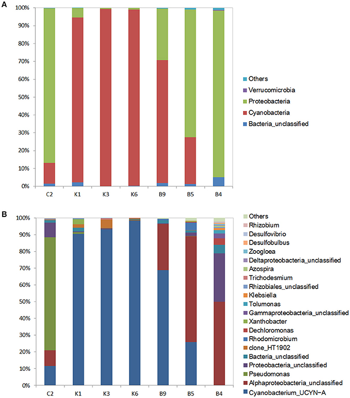 Figure 2. Phylogenetic composition of the 16s rRNA gene sequences in the surface water of the nine stations at the phylum level (A) and at the genus level (B). “Others” refer to unclassified OTUs. In (B), only the relative abundances of the top 20 genera are listed. For clarity, multiple OTUs with the same taxonomic classification were grouped together.