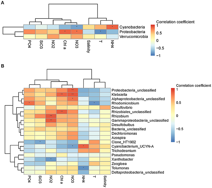 Figure 3. Spearman's rank correlation coefficient between relative abundance of bacterial communities and environmental variables at the phylum level (A) and the genus level (B). **P < 0.01 and *P < 0.05 indicate significant correlation.