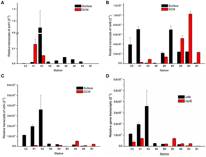 Figure 6. Relative transcripts of amt1, narB, and urtA in the cyanobacterial genera Prochlorococcus and Synechococcus between the surface and DCM layers of the sampling stations (A–C) and a comparison of the relative transcripts of urtA and narB in the surface samples (D). Error bars represent the standard deviations of the valuesgenerated from three biological repeats.