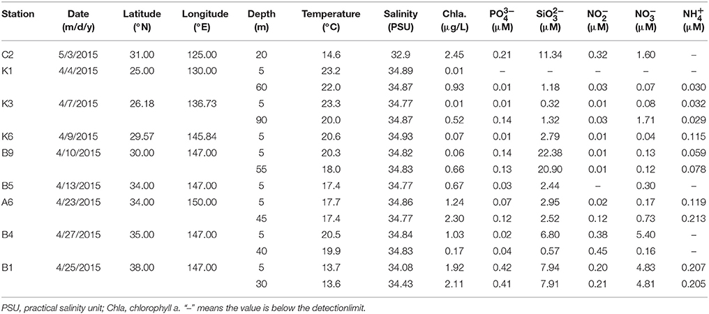 The NWPO cruise was conducted from 30th March to 10th May 2015, crossing through the East China Sea and pelagic western Pacific Ocean (Figure 1). Microbial samples of surface seawater (0–5 m) were collected from nine stations for bacterial diversity analysis. At each sampling station, approximately 30 L of seawater was collected using Niskin bottles attached to a CTD rosette, and pre-filtered through a 3 μm membrane (Whatman 47 mm polycarbonate membrane) to remove large zooplanktonas well as separate or fasciculate filamentous Trichodesmium. Then, the seawater was filtered through a 0.2 μm membrane (Whatman 47 mm polycarbonate membrane) to concentratethe microorganisms. Microbial samples for N-utilizing gene analysis were collected from both the surface and deep chlorophyll maximum (DCM) layers and 30 L of seawater for each sample was filtered as mentioned above. It should be noted that a water sample at the 20-m depth was collected from station C2 because of the well-mixed water column, while only surface waters were sampled from stations K6 and B5 owing to poor sea conditions. Collected samples were immediately frozen in liquid nitrogen after 20 min processing time and stored at −80°C before further analysis. Physicochemical parameters of the surface and DCM layers in each station were analyzed. Temperature, salinity, and Chlorophyll a (Chla) were measured using a conductivity-temperature-depth rosette system [CTD, Sea Bird Electronics] (Data Sheet 2). Skalar San++ continuous flow analyzer was used to measure the concentrations of phosphate, silicic acid, ammonium, and nitrate plus nitrite (Gordon et al., 1993). Nitrate concentration was determined by subtracting nitrite concentration from the total concentration of nitrite and nitrate.