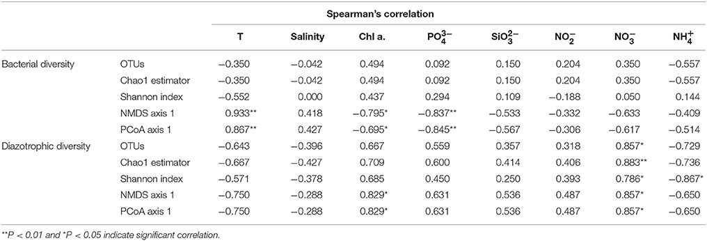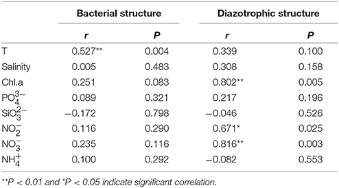 Table 2. The spearman's correlations among bacterial community, diazotrophic diversity, and environmental factors.