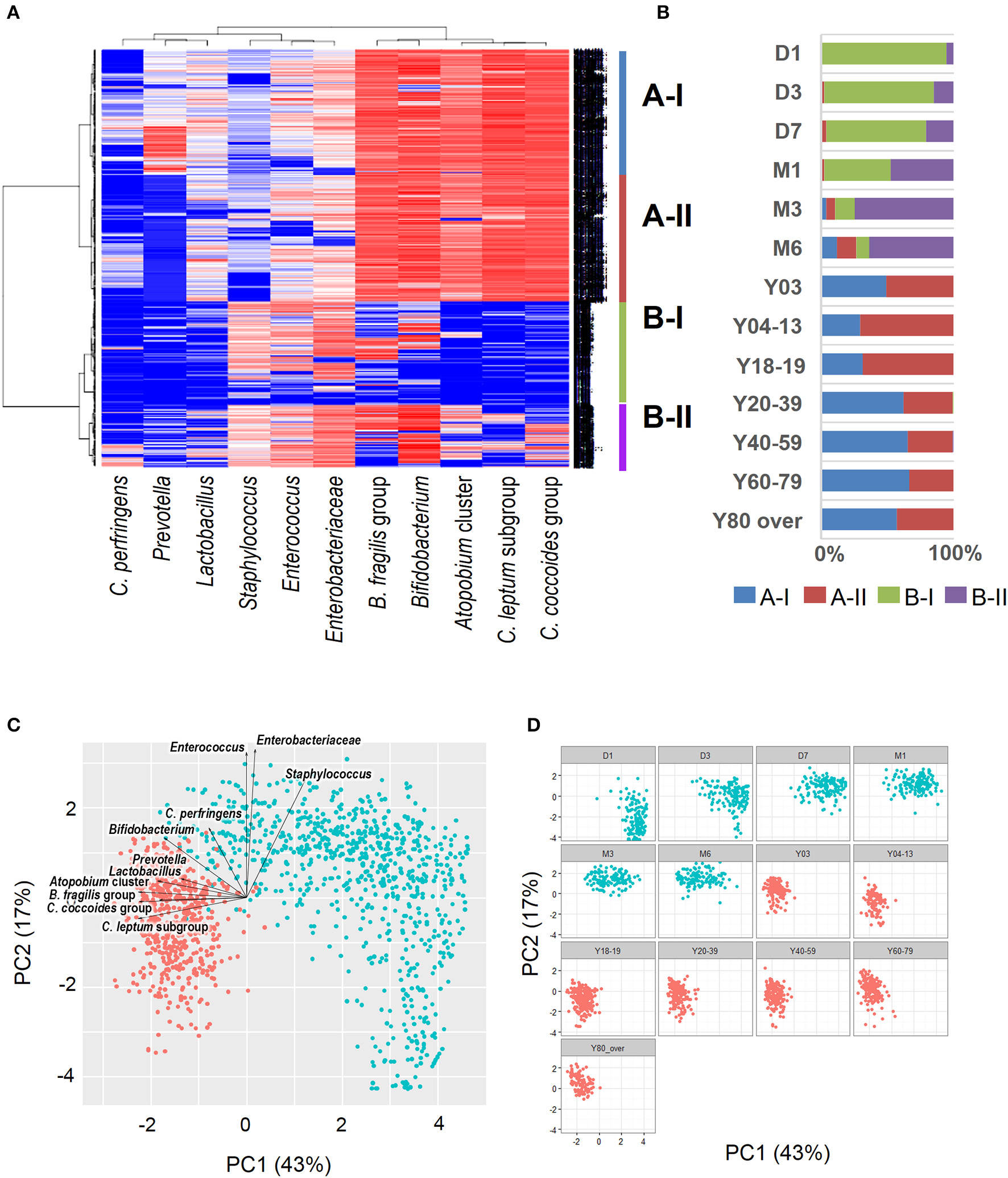 Recent sequence analyses using bacterial 16S rRNA genes have reported that gut microbiota diversity in newborns undergoes a gradual increase early in life, but reaches a plateau by 3 years of age, at which time the microbial configuration and diversity become equivalent to those in adults (Nakayama, 2010; Yatsunenko et al., 2012; Odamaki et al., 2016). Further age-related quantitative changes in intestinal bacterial populations have been shown by YIF-SCAN analysis the predominant bacterial populations and those present at lower levels, such as Enterobacteriaceae, lactobacilli, and pathobionts. Moreover, the data from our integrated database, namely bacterial counts and relative proportions (Figure 1) and heat-map and principal component (PCA) analyses (Figure 2), demonstrate that the intestinal microbiota stabilizes at about age 3 years. However, detailed observation of major 11 intestinal bacterial groups (Figure 1A) reveals that, although the numbers of predominant obligate anaerobes stabilize by age 3 years, several LCCM, including Prevotella, Enterobacteriaceae, and Enterococcus, are still in the process of transition have not yet stabilized. Also, as reported in previous studies (Hayashi et al., 2003; Bartosch et al., 2004; Woodmansey et al., 2004; Mitsuoka, 2005; Mueller et al., 2006; Tiihonen et al., 2008; Enck et al., 2009; Mariat et al., 2009), in elderly people the levels of Bifidobacterium are decreased, whereas those of Lactobacillus and Enterobacteriaceae are increased (Figures 1A,B). On the basis of hierarchical clustering of the dataset, we were able to classify the 1951 subjects into four groups, namely AI, AII, BI, and BII (Figure 2A); 94.8% of subjects belonging to groups AI and AII were aged 3 years or older (adult type), whereas 99.7% of subjects from groups BI and BII were aged 6 months or less (infant group) (Figure 2B). Notably, these age-related differences are further clearly corroborated by differences in the PCA components of infant-type vs. adult-type cohorts (Figures 2C,D).