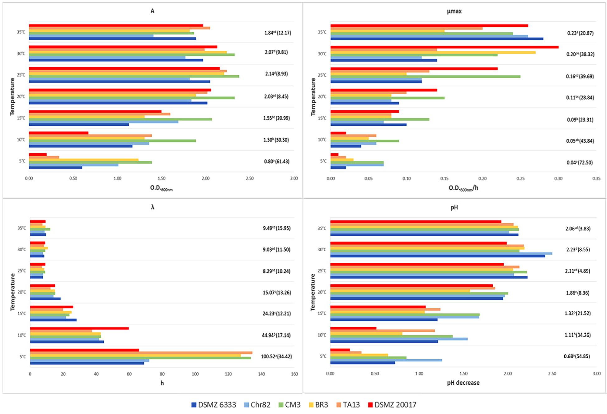 FIGURE 2. Growth of L. sakei strains in MRS at different temperatures: estimates of the Gompertz parameters and pH decrease (initial value about 6.0). A represents the maximum OD600 value reached, μmax is the maximum OD600 increase rate in exponential phase and λ is the lag time. For each temperature, the mean value is reported and the relative coefficient of variation is indicated between brackets. Means with the same letter are not statistically different (P > 0.05) according to the post hoc (LSD test) comparison of ANOVA.