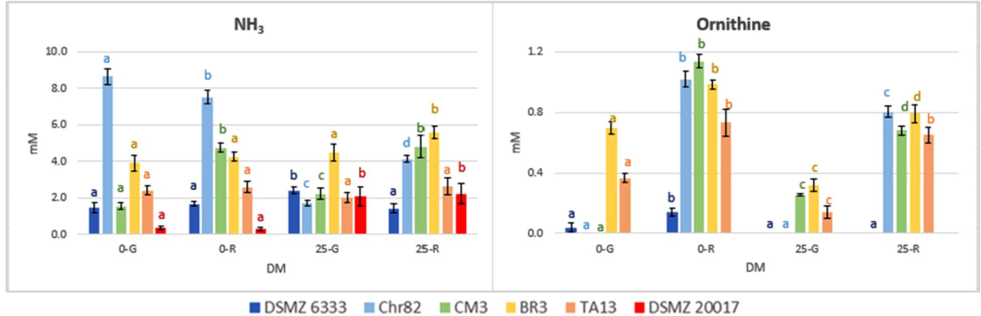 FIGURE 6. Ornithine and NH3 concentration in DM (expressed as mM) after 24 h of incubation. The standard deviations are reported. For each strain, different letters indicate significant differences (P < 0.05) according to ANOVA.