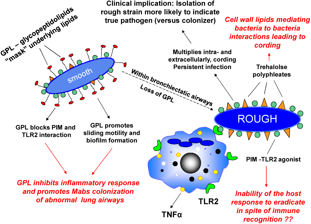FIGURE 1. Environmental Mycobacterium abscessus (MABS) isolates have the smooth colony morphotype and express glycopeptidolipid (GPL). GPL in the outermost aspect of the cell wall “masks” underlying glycosylated lipoproteins such as phosphatidyl-myo-inositol mannosides (PIMs) involved in immune recognition and blocks the bacterial cell–cell interaction of lipids such trehalose polyphleates which may play a role in clumping and cord formation. By preventing MABS from being recognized by innate immune surveillance mechanisms and promoting biofilm formation, GPL facilitates colonization of bronchiectatic lung airways. After colonization, spontaneous or temperature sensitive loss of GPL is associated with “unmasking” of these molecules. This leads to recognition by TLR2 on macrophages and respiratory epithelial cells resulting in release of the proinflammatory cytokines TNFα (from macrophages) and IL-8 (from respiratory epithelial cells). Rough variants acquire a virulent phenotype characterized by the ability to grow in serpentine cords and cause macrophage apoptosis leading to rapid cell–cell spread and propagation of infection. Isolation of MABS rough variants from the sputum is associated with progressive lung infection.