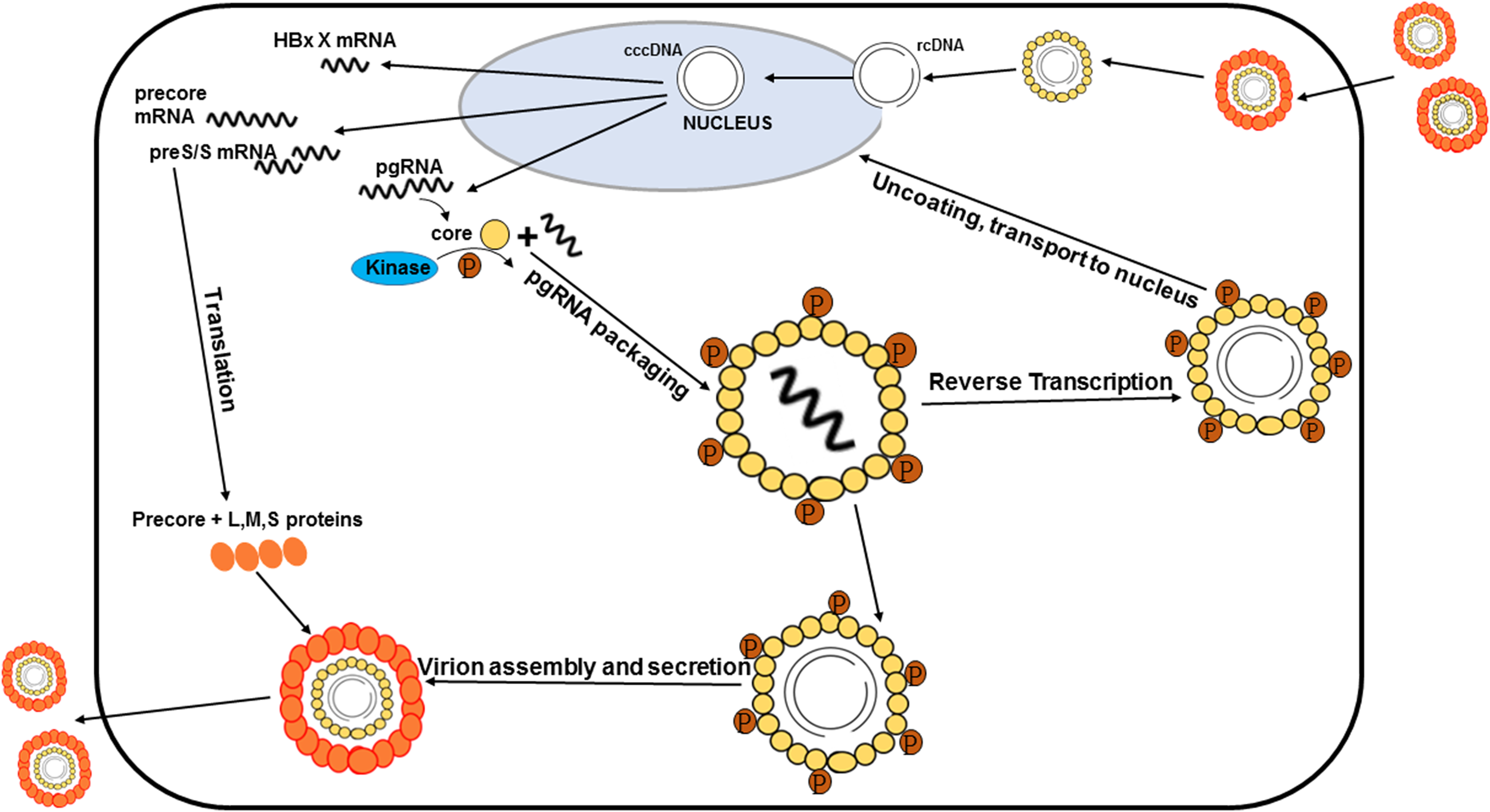 Processes of the HBV life cycle regulated by HBc phosphorylation. HBc phosphorylation can regulate reverse transcription, pgRNA packaging, subcellular localization, and virion secretion. Phosphorylation of the core protein is also essential for capsid maturation.