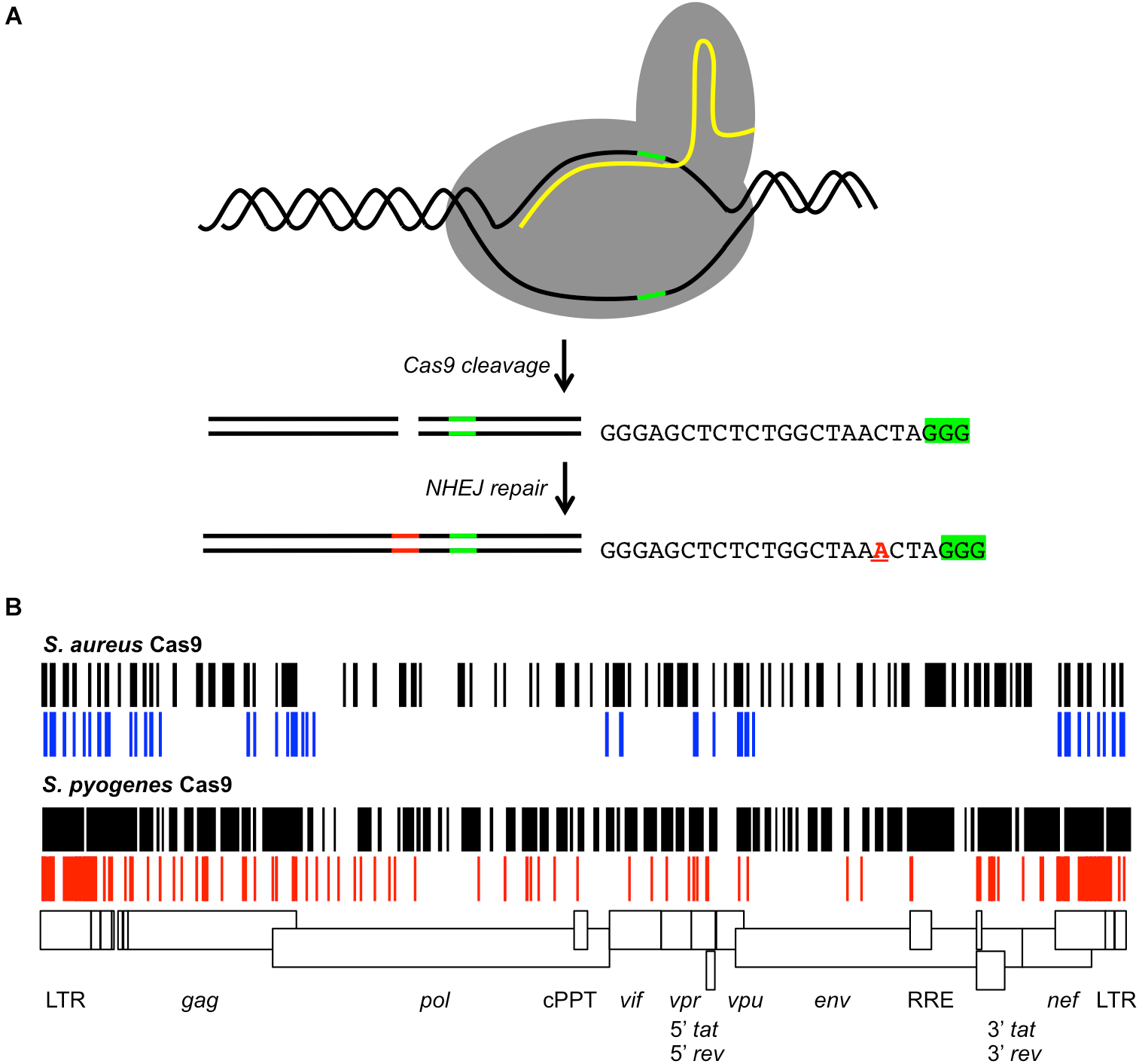 Figure 2. CRISPR/Cas9 gRNAs targeting the HIV-1 provirus. (A) Cartoon of Cas9 cleavage of target DNA. The Cas9 protein (gray) binds the target DNA (black lines) and gRNA (yellow line). The PAM signal (green line) is adjacent to the gRNA homology region. Cas9 generates a DSB 3 bp 5′ of the PAM. DNA repair by NHEJ may insert or delete nucleotides (red lines) at the cleavage site. As an example, the sequence of a gRNA targeting the HIV-1 TAR element is shown with the PAM signal 5′-GGG-3′ (green highlight). The observed repair products included insertion of a single nucleotide at the cleavage site (red A) (Yoder and Bundschuh, 2016). (B) The possible S. aureus or S. pyogenes gRNAs throughout the proviral genome of the laboratory strain HXB2 for Cas9 are shown (black) relative to a scale map of the HIV-1 genome. Previously reported S. aureus gRNAs are shown in blue, S. pyogenes gRNAs in red. Features of the HIV-1 genome are indicated by boxes. Differences between the possible gRNAs and reported gRNAs are due to strain differences.