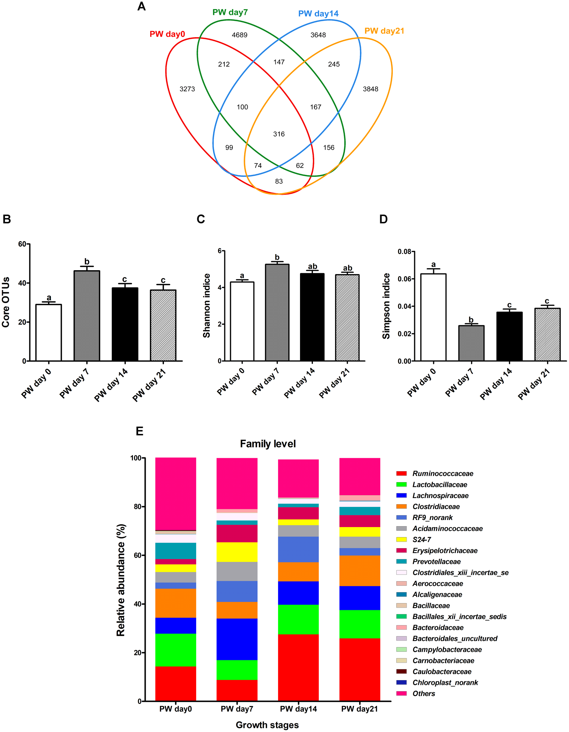 Jejunal microbial diversities and bacterial compositions of weaned piglets. Venn diagram showing the unique and shared operational taxonomic units (OTUs) (3% distance level) (A), core OTUs (>1.00% of the community) (B), estimated Shannon index (C), estimated Simpson index (D), and bacterial compositions at the family level (E) of jejunal samples from weaned piglets. OTUs, operational taxonomic units; PW, post-weaning. Bars (mean ± SEM, n = 5) with different letters are considered significantly different (P < 0.05).