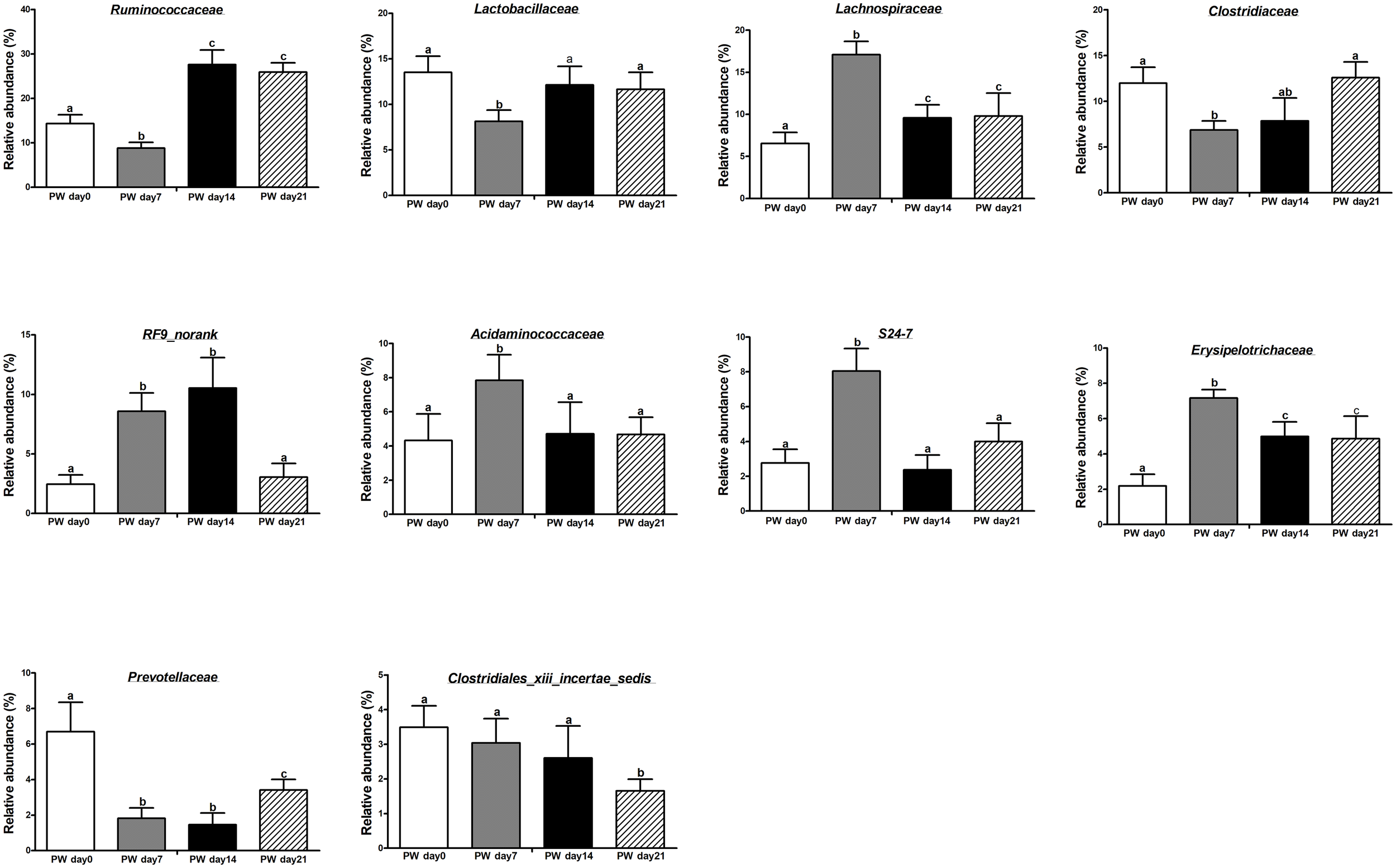 The core bacteria (at the family level) in the jejunum of weaned piglets. PW, post-weaning. Bars (mean ± SEM, n = 5) with different letters are considered significantly different (P < 0.05).