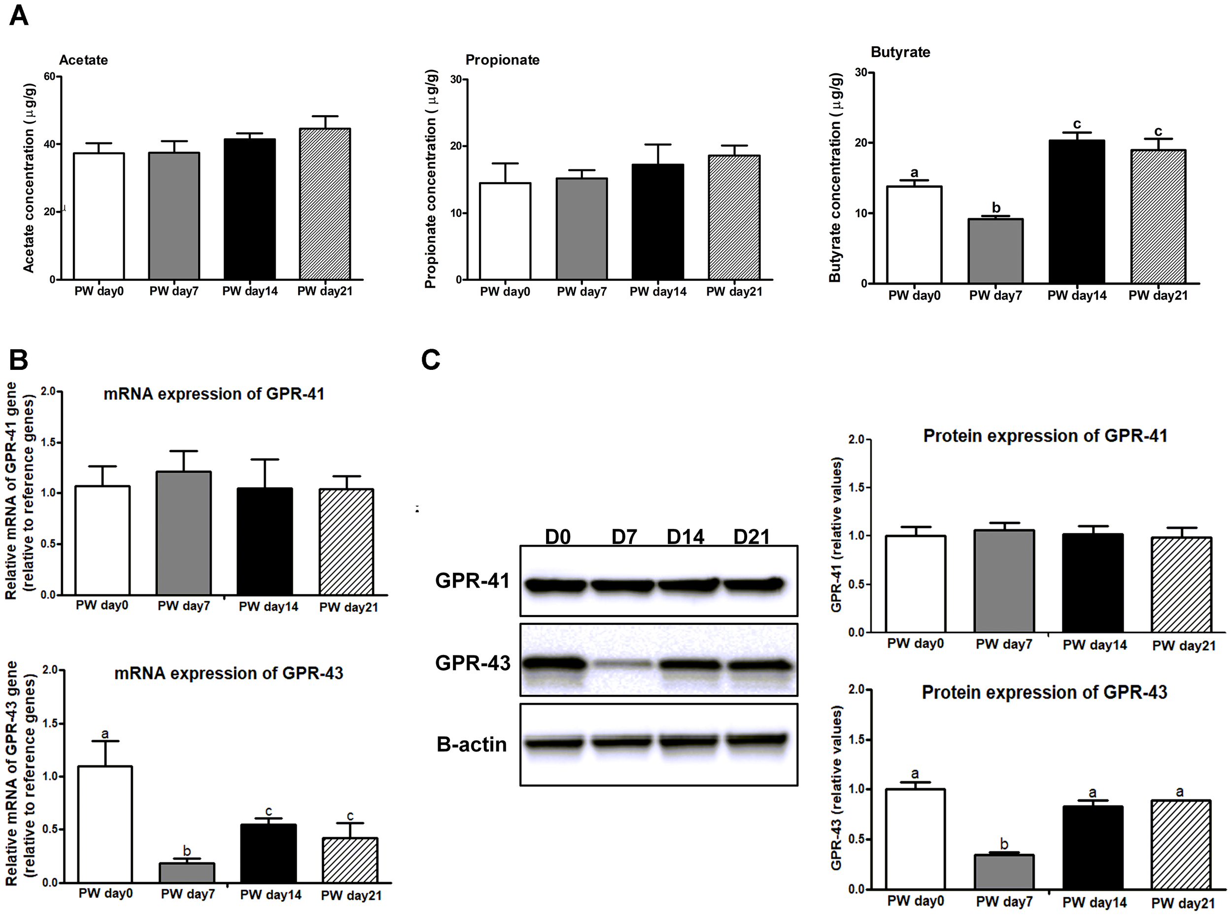 The SCFAs and its receptors in the jejunum of weaned piglets. (A) The ratios of acetate, propionate, and butyrate to total SCFAs in the jejunum of piglets during the first 3 weeks post-weaning. (B) The mRNA expression of SCFAs receptors (e.g., GPR41 and GPR43) in the jejunum of weaned piglets. (C) Representative western blot and quantification of SCFAs receptors (e.g., GPR41 and GPR43) in the jejunum of weaned piglets. B-Actin was used as the loading control. SCFAs, short-chain fatty acids; PW, post-weaning; D0, post-weaning day 0; D7, post-weaning day 7; D14 = post-weaning day 14; D21, post-weaning day 21. Bars (mean ± SEM, n = 5) with different letters are considered significantly different (P < 0.05).