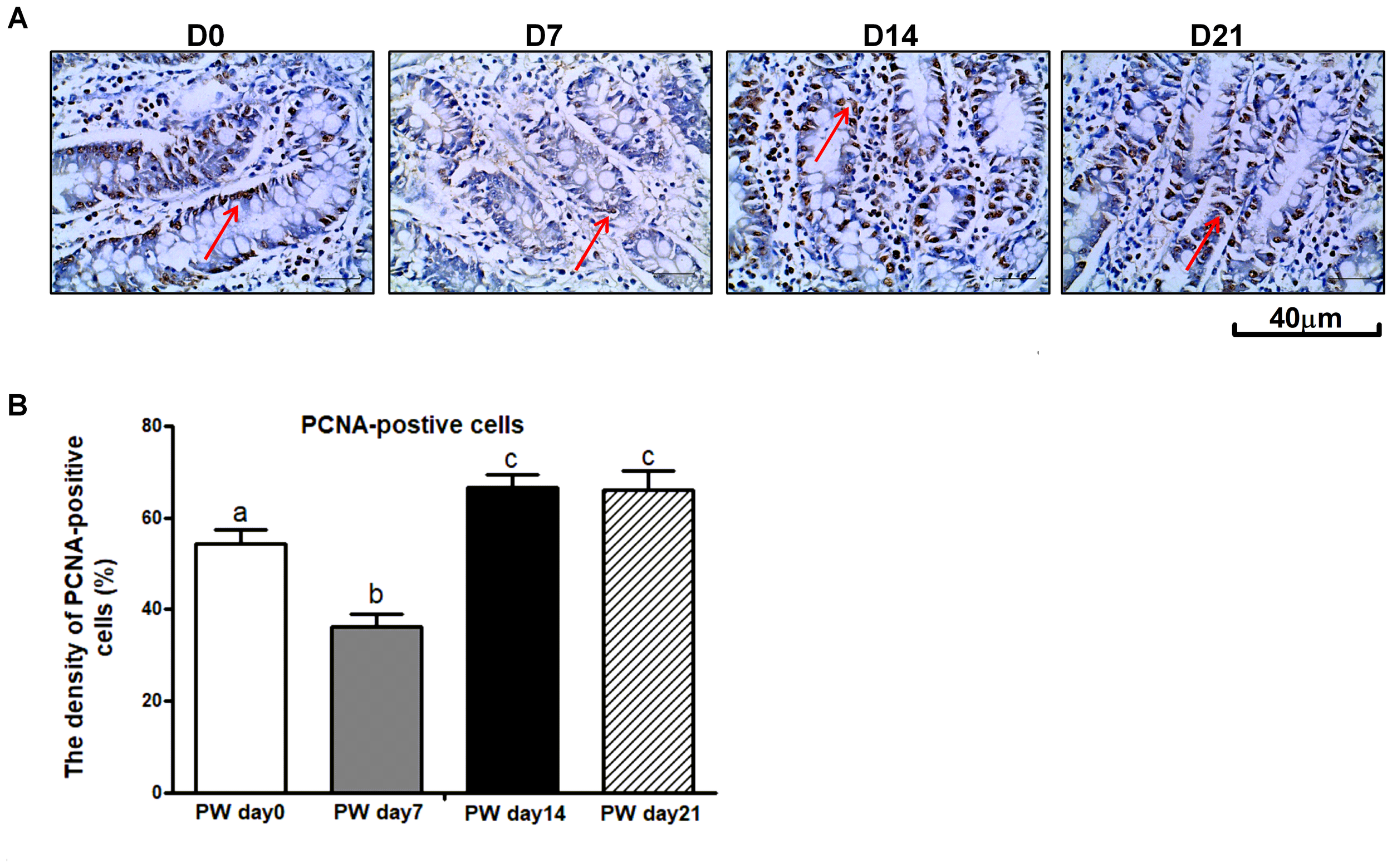 The immunohistochemistry protocol was adapted from a previously published method (Wang et al., 2015a). Briefly, paraffin-embedded tissue slides were first deparaffinized by soaking in 100% xylene and rehydrated with a decreasing percentage of ethanol. After the paraffin-embedded tissue slides were deparaffinized, they were incubated in a bath containing 10 mmol/L sodium citrate (pH 6.0) at 85–90°C for 45 min and then transferred to 0.20% sodium borohydride. Next, the slides were blocked in blocking buffer at room temperature for 45 min. Subsequently, the slides were incubated in porcine monoclonal-PCNA antibody (Bioss, Co., Beijing, China) overnight at 4°C. After the primary antibody was rinsed off, the slides were incubated with biotin-conjugated goat anti-pig immunoglobulins (1:200; Bioss, Co., Beijing, China) for 1 h at room temperature. Next, the slides were treated with horseradish peroxidase-conjugated streptavidin (ComWin Biotech, Co., Beijing, China) for 30 min and then reacted with 3,3-diaminobenzidine tetrahydrochloride (ComWin Biotech, Co., Beijing, China) as the colored chromogen to visualize the antigenic structures. The slides were then counterstained in Harris hematoxylin, mounted using liquid mounting medium with coverslips, and examined under bright field light microscopy at 100× magnification.