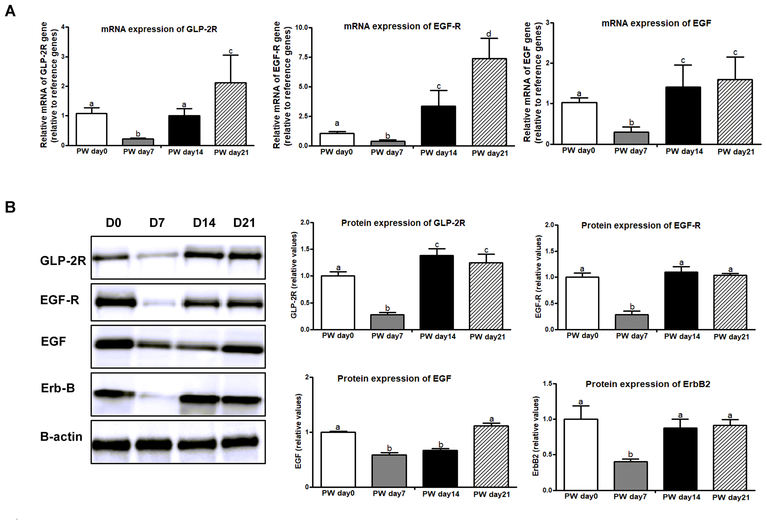 The procedure of western blotting was performed as described earlier (Li G. et al., 2014). Briefly, after protein samples were extracted from the jejunal mucosa, the protein contents were determined spectrophotometrically at OD562 using the Protein Quantitative Reagent Kit-BCA Method (ComWin Biotech, Co., Beijing, China). Primary antibodies of Bcl-2, Bax, activate-Caspase 3, activate-Caspase 9, GLP-2R, EGF, EGFR, ErbB, and B-actin were purchased from ABcam (Cambridge, United Kingdom), and primary antibodies of GRP41 and GRP43 were purchased from Santa Cruz Biotechnology (Santa Cruz, CA, United States). B-Actin was used as the loading control, and normalization and quantification of the bands was carried out using Quantity-One software (Bio-Rad).