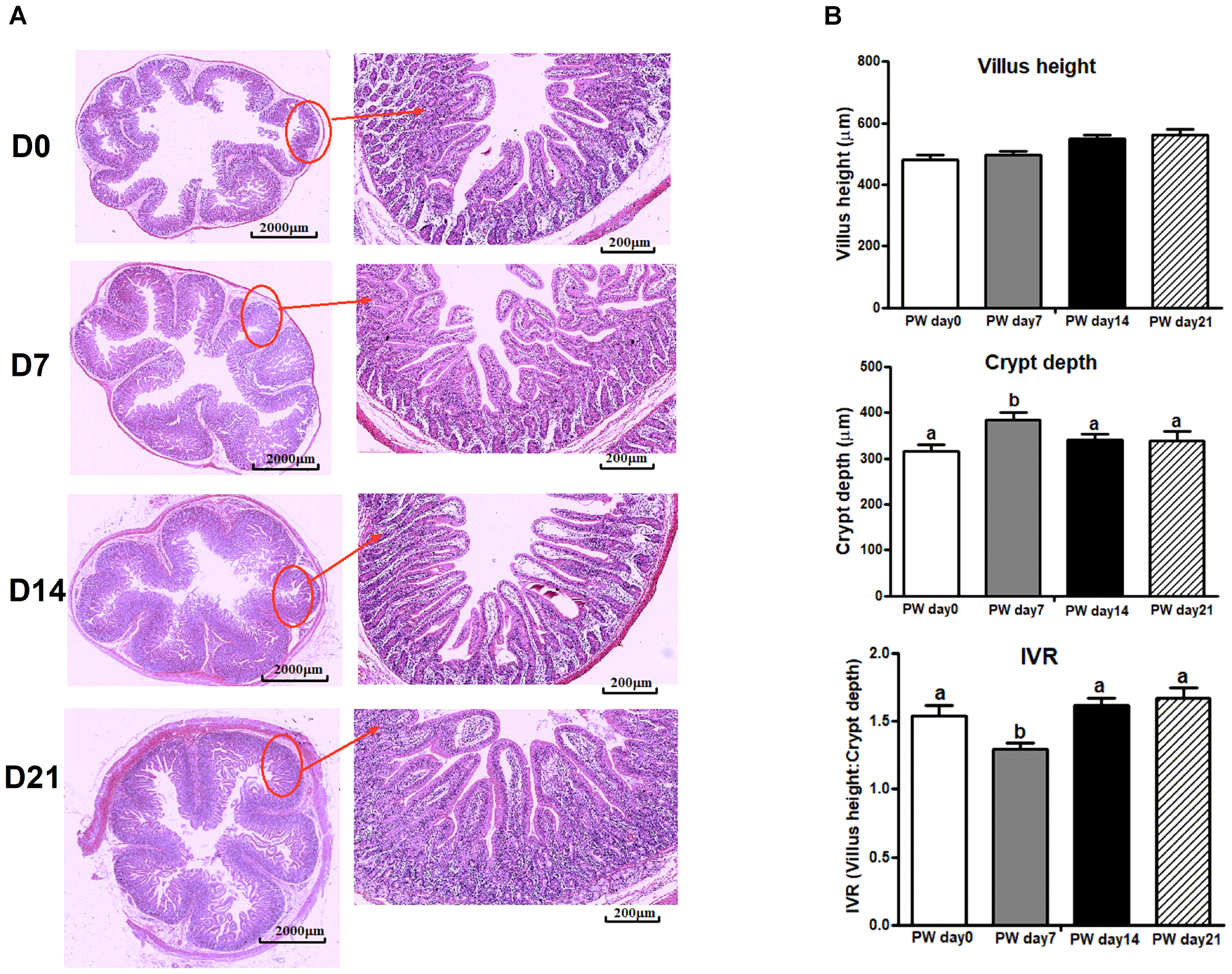 At the start of the post-weaning period (day 0) and at days 7, 14 and 21, five piglets at each time point were selected to sacrifice using an intravenous injection of sodium pentobarbital (approximately 150 mg/kg BW), and the jejunum of each was collected. Firstly, approximately 5 g of digesta from mid-jejunum were snap-frozen in liquid nitrogen and subsequently stored at -80°C for full length 16S rRNA and SCFAs analysis. Secondly, after slitting the jejunum lengthwise and gentle rinsing with ice-cold 1× PBS, the jejunal mucosa was scraped with a glass slide and rapidly placed in liquid nitrogen for measuring digestive enzymes, pro-inflammatory cytokines, signaling markers of cell apoptosis and cell proliferation, and SCFA receptors. Finally, an approximately 3.00-cm jejunal segment was rinsed with ice-cold 1× PBS and then fixed in 10% neutral formalin for measuring jejunal morphology and the immunohistochemistry of proliferating cell nuclear antigen (PCNA).