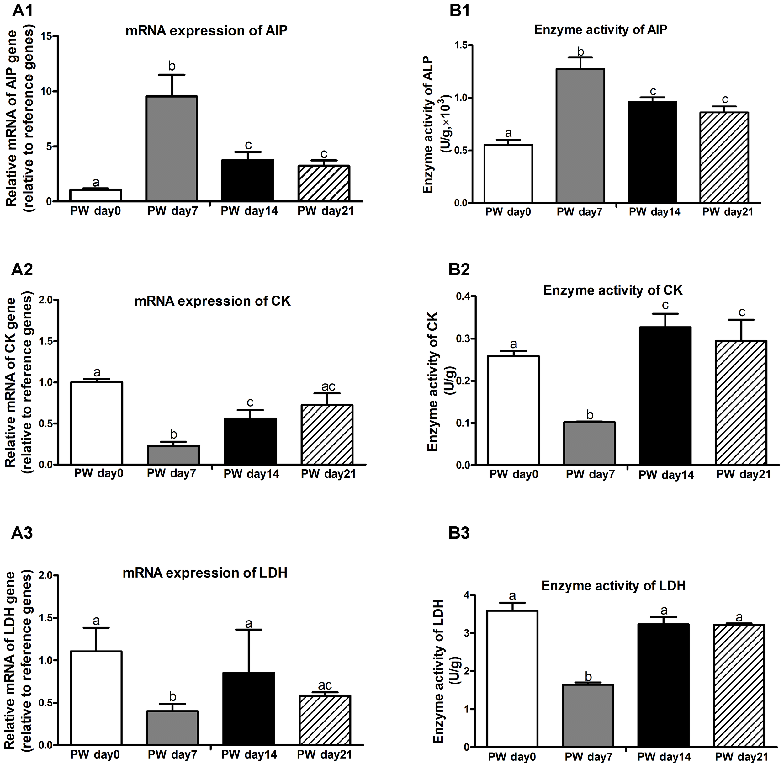 The activities of alkaline phosphatase (AIP), creatine kinase (CK), and lactate dehydrogenase (LDH) in jejunal mucosa were assayed with Enzyme Activity Detection Kits (NanJing JianCheng Bioengineering Institute, Nanjing, China).