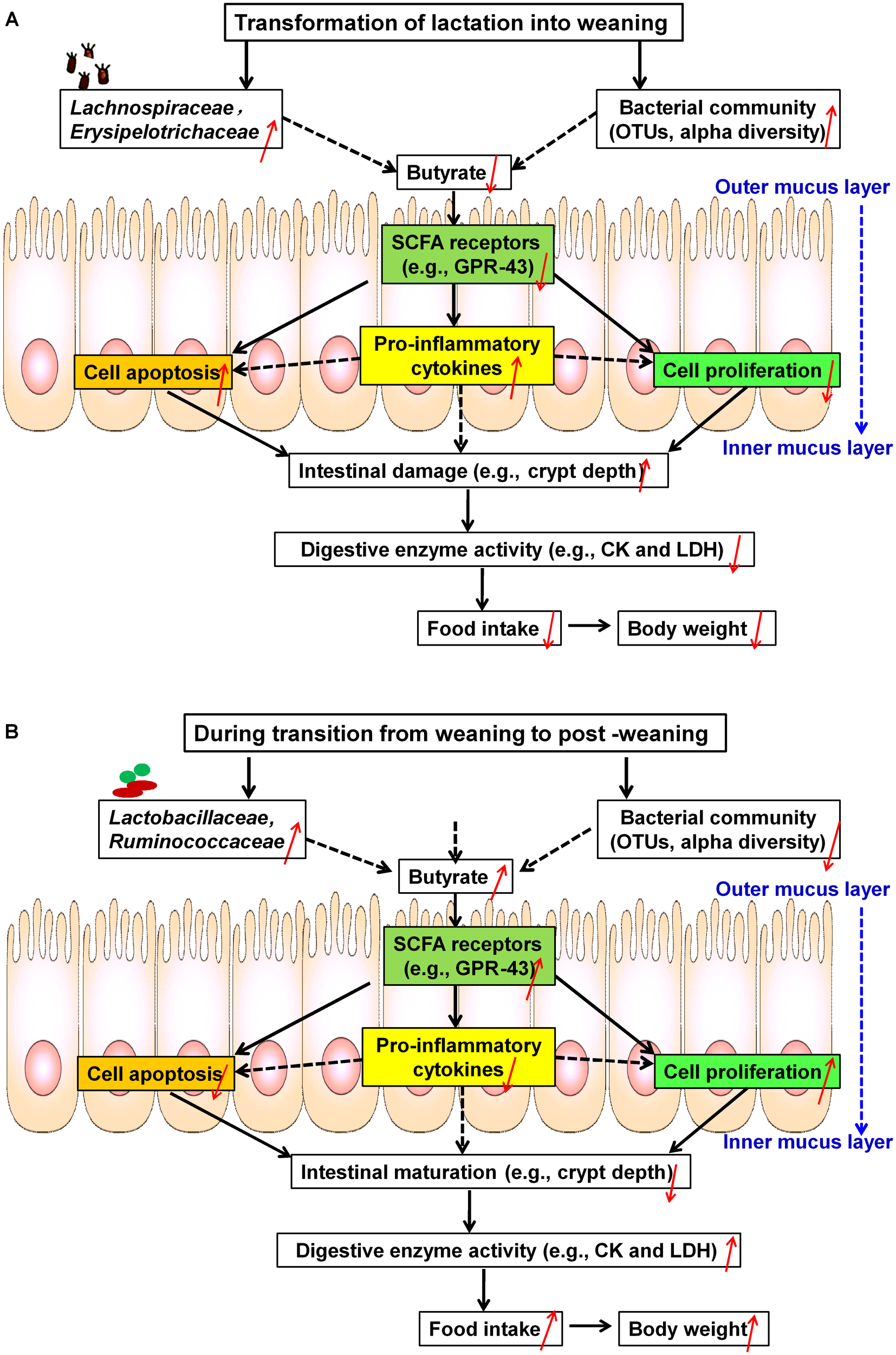 Butyrate is one of the major short-chain fatty acids (SCFAs) and is produced by microbial fermentation in the gastrointestinal tract (GIT) (Wang et al., 2011). In addition to being used as a substrate for energy production, butyrate promotes cell proliferation and inhibits cell apoptosis, leading to the functional maturation of intestinal epithelial cells (Hamer et al., 2008). Furthermore, butyrate can mediate the effects of intestinal microbiota on the host’s appetite, metabolism, adiposity, and immunity (Meijer et al., 2010; Wang et al., 2011). Intriguingly, intestinal epithelial cells undergo functional and morphological differentiation during migration along the crypt-villus axis (Mariadason et al., 2005; Xiong et al., 2015). As a result, the turnover (i.e., proliferation, differentiation, and apoptosis) of intestinal epithelial cells is essential for mucosal development, maintenance, and recovery from tissue damage during the suckling-weaning transition period (Yang et al., 2013). However, the mechanisms underlying the signaling effects of butyrate on the apoptosis and proliferation of intestinal epithelial cells along the crypt-villus axis have not yet been elucidated.