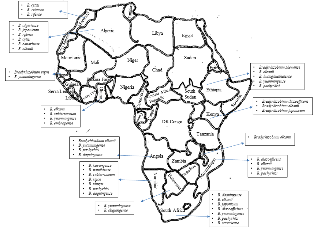 Also, we still do not understand the community structure and composition of bradyrhizobia found in African soils, even though we know that only certain types of bradyrhizobia are known to nodulate the diverse range of legumes grown in Africa (see Figure 1). Studies based on a few African countries seem to suggest that the number, species and strains of bradyrhizobial populations found in African soils are individually and collectively much greater than that shown in Figure 1. Only future studies will unravel the scale of novel bradyrhizobia resident in African soils that are waiting to be discovered and identified using modern molecular technologies. This review summarizes the status of legume root nodulation by bradyrhizobia in Africa.