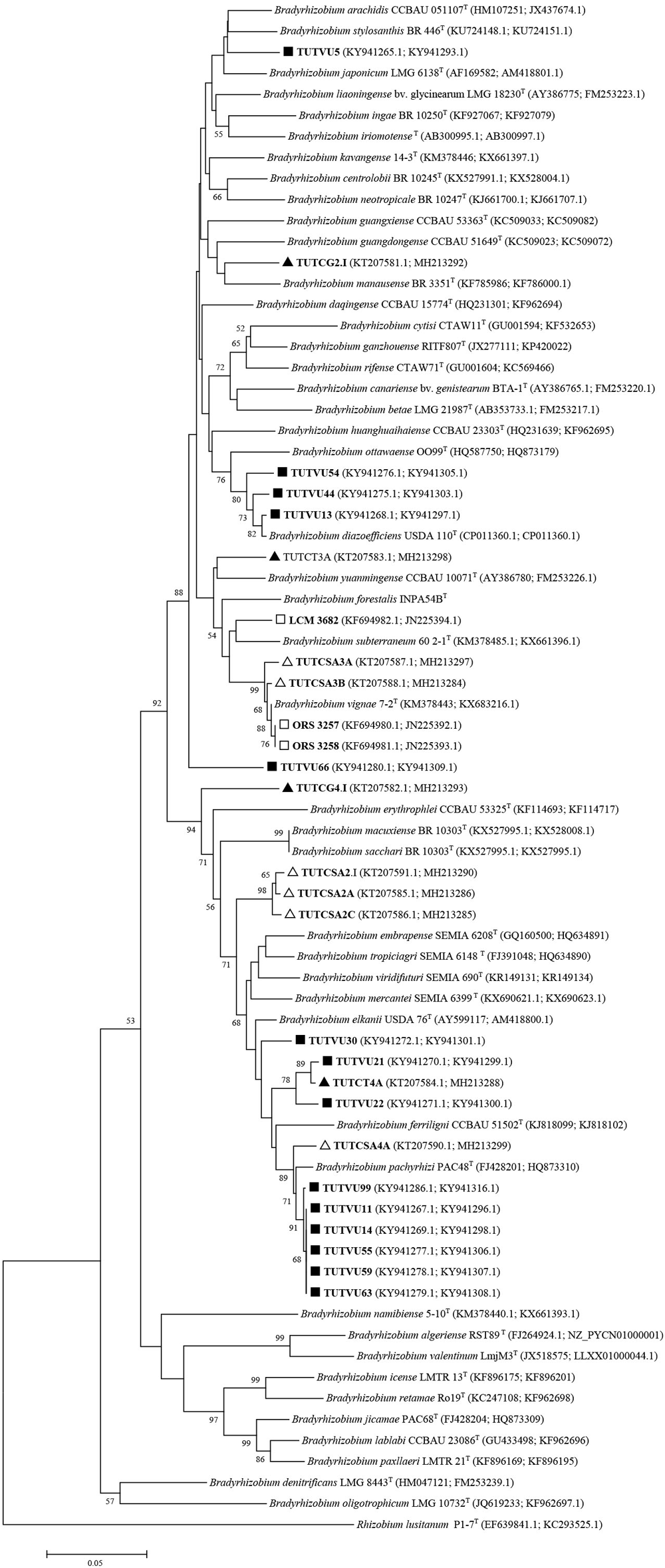 Neighbor-joining molecular phylogenetic analysis of cowpea nodulating rhizobia from ▲Ghana, □ Senegal, ■ Mozambique, and △ South Africa based on concatenated glnII + gyrB (495 bp) sequences with type strains of Bradyrhizobium species. The evolutionary history was inferred by using the Neighbor-joining method based on the Kimura 2-parameter model. The scale bar indicates the number of substitutions per site. The percentage of trees in which the associated taxa clustered together in the bootstrap test (1000 replicates) are shown next to the branches. All positions containing gaps and missing data were eliminated. Evolutionary analyses were conducted in MEGA6.