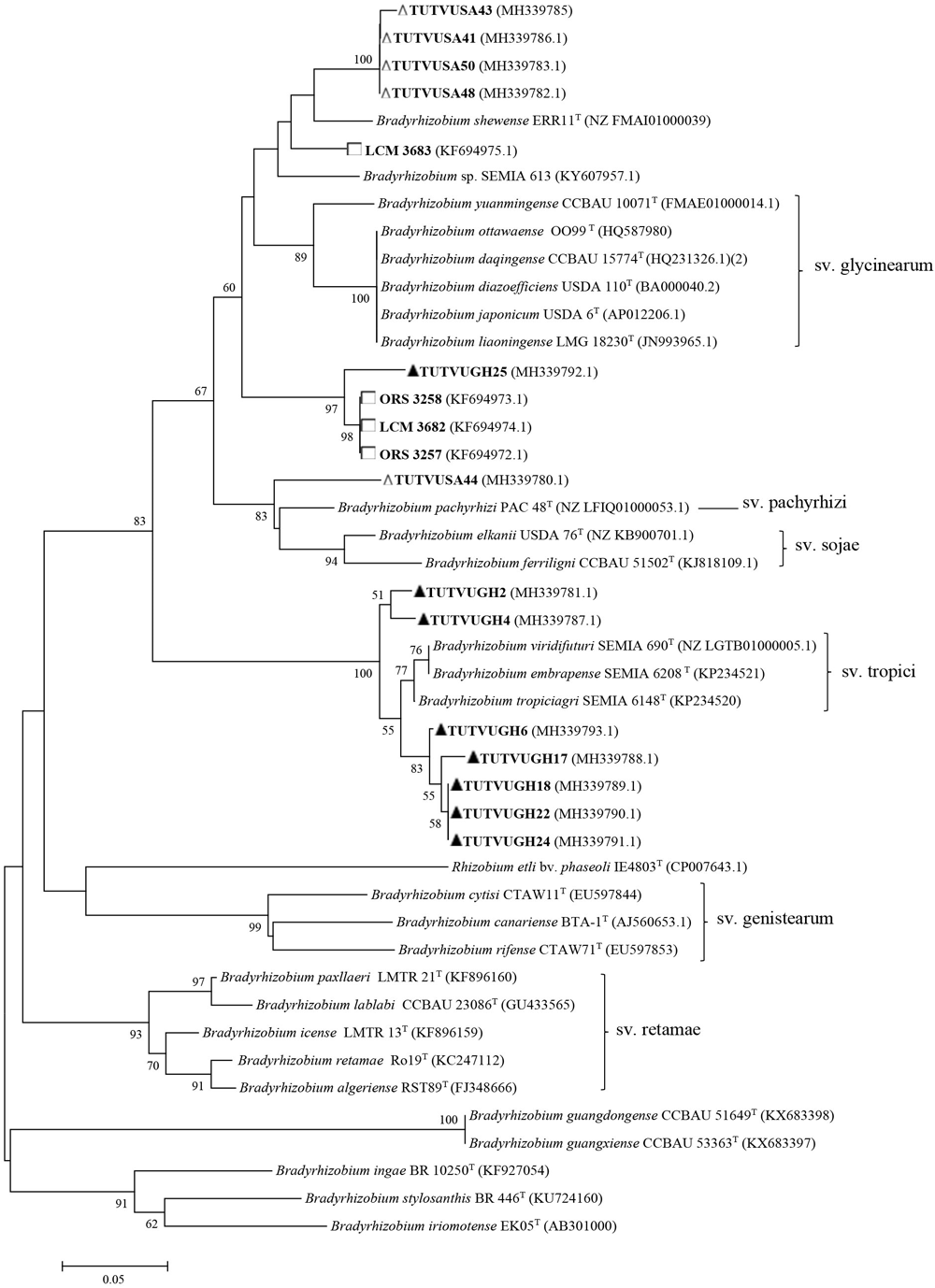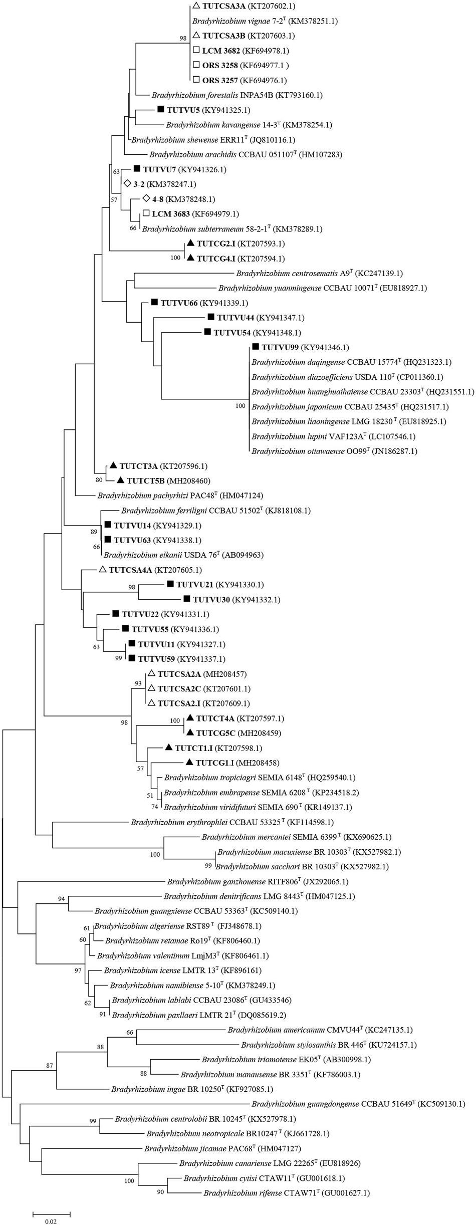 Neighbor-joining molecular phylogenetic analysis of cowpea nodulating rhizobia from ▲Ghana, □ Senegal, and △ South Africa based on nodC sequences with type strains of Bradyrhizobium species. The evolutionary history was inferred by using the Neighbor-joining method based on the Kimura 2-parameter model. The scale bar indicates the number of substitutions per site. The percentage of trees in which the associated taxa clustered together in the bootstrap test (1000 replicates) are shown next to the branches. Evolutionary analyses were conducted in MEGA6.