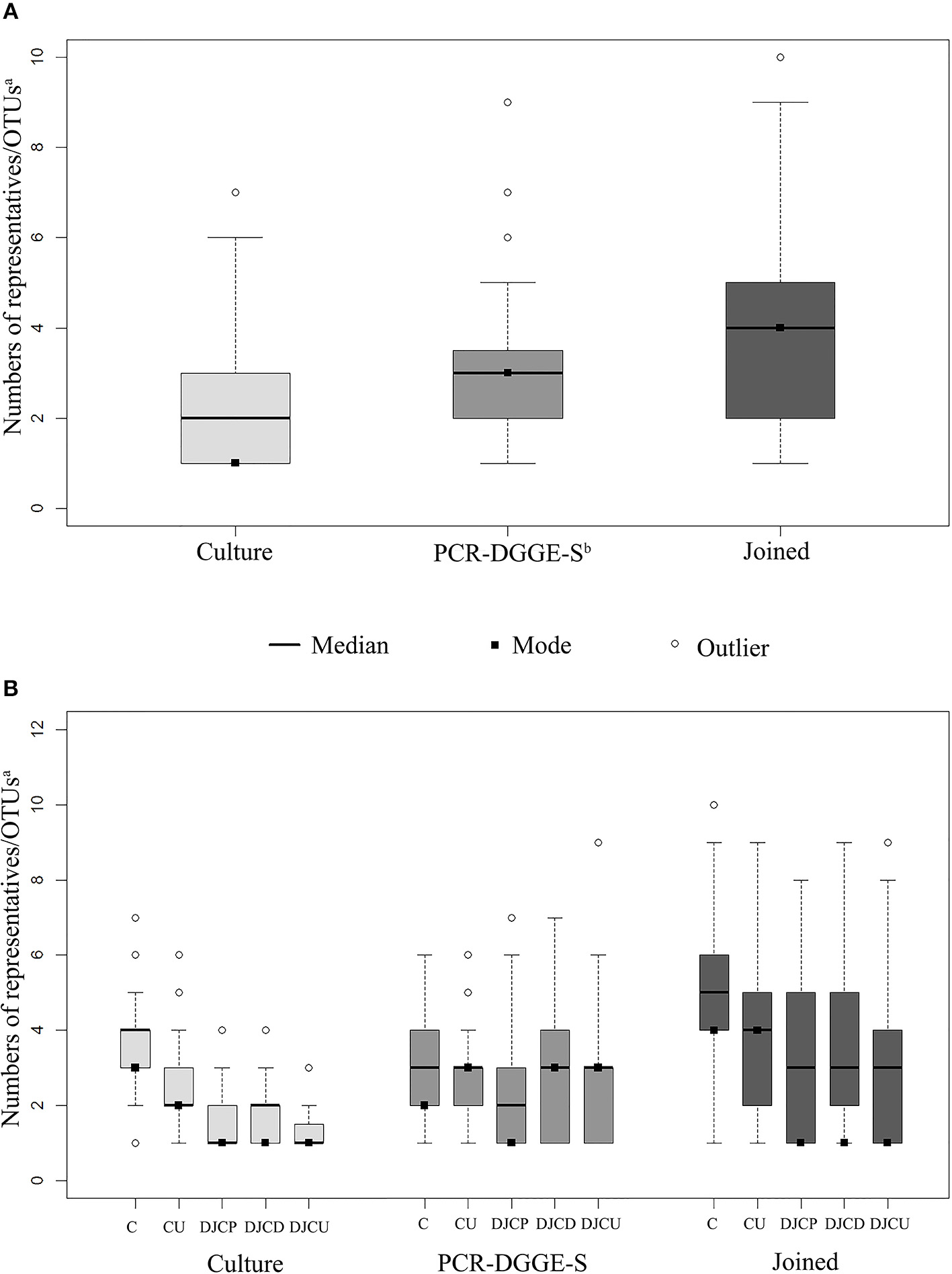 Figure 1. Sample boxplots. Graph (A) shows the distribution in sample results regarding methods, (B) shows results distribution regarding the method and material type. Joined results are the union of culture and PCR-DGGE-S result subsets. The whiskers represent 1.5 interquartile range. aOTU, operational taxonomic unit; bPCR-DGGE-S, PCR denaturing gradient gel electrophoresis, Sanger sequencing; C, catheters; CU, catheter urine; DJCP, proximal tip of double-J catheter; DJCD, distal tip of double-J catheter; DJCU, double-J catheter urine.