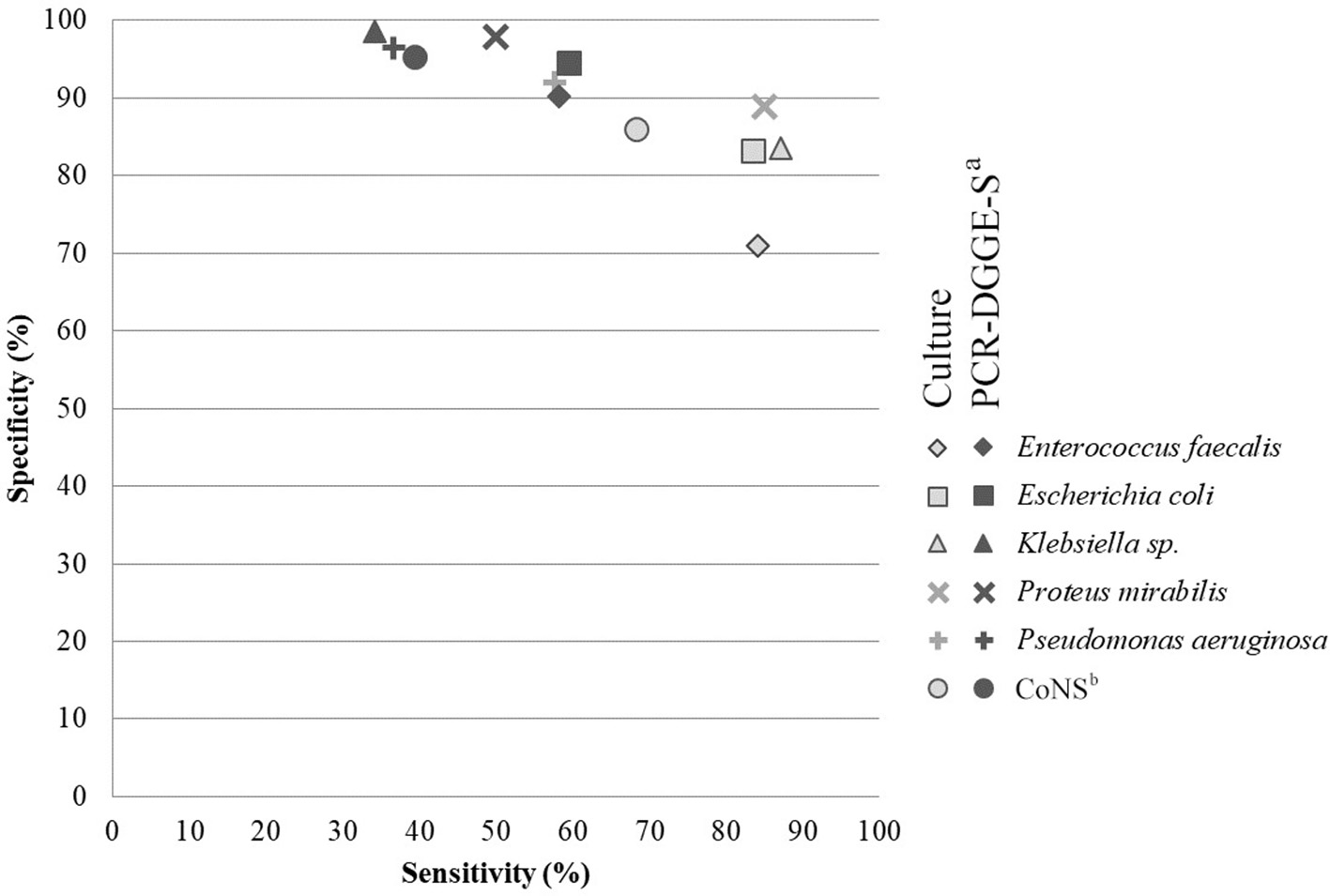 Figure 2. Comparison of analytical sensitivity and specificity of culture and PCR-DGGE-S. The figure shows analytical specificity and sensitivity relation. Parameters for six most prevalent species detectable by both methods were chosen and included. Light-gray indicates values for culture (PCR-DGGE-S is a reference method) and dark-gray for PCR-DGGE (culture is a reference), respectively. aPCR-DGGE-S, PCR, denaturing gradient gel electrophoresis, Sanger sequencing; bCoNS, Coagulase-negative Staphylococci.