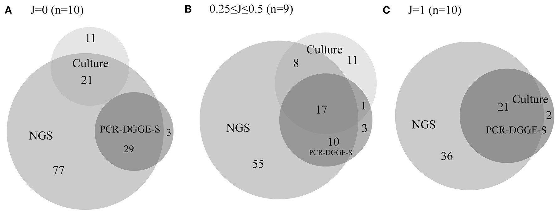Figure 3. Euler diagrams with a number of representatives detected by culture, PCR-DGGE-S and NGS. The figure shows Euler proportional diagrams with absolute numbers of representatives detected by particular methods. Diagram (A) shows samples with no concordance in culture and PCR-DGGE-S results, therefore these sets are not overlapping. Diagram (B) shows samples with partial concordance in culture and PCR-DGGE-S results, and finally diagram (C) shows samples with entirely concordant culture and PCR-DGGE-S results, therefore dark set represents results of both these methods. In 17 samples, PCR-DGGE-S or culture identified additional representatives over the NGS, while NGS detected an additional bacteria over any non-NGS method in 28 out of 29 sample.