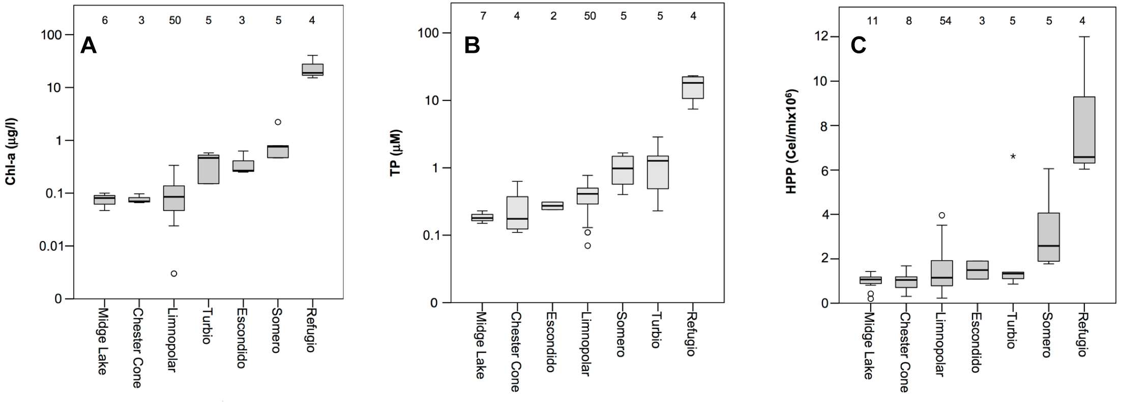 Box plot of historical data of concentrations of (A) chlorophyll-a (Chl-a in log-scale), (B) total phosphorus (TP in log-scale), and (C) the abundance of heterotrophic bacterioplankton (HHP) measured in the lakes studied. Numbers inside the charts indicate the number of samples. The boundaries of the box indicate the 25th and 75th percentiles. Solid line indicates median value. Lakes in each plot are ordered from lowest to highest median value of the variable reported in the chart.