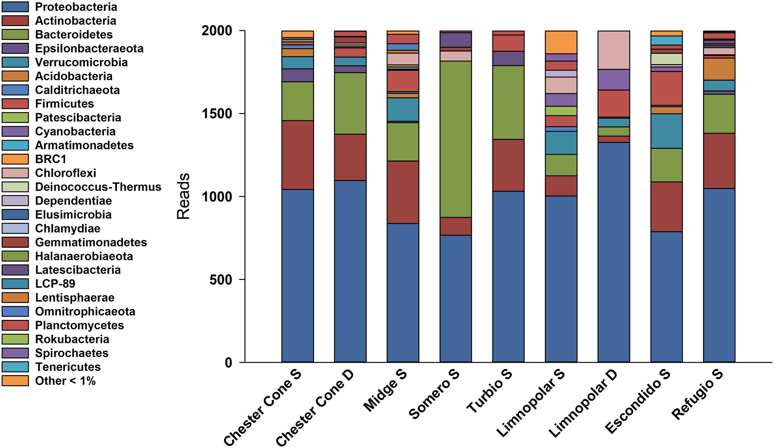 | Chester S | Chester D | Midge | Somero | Turbio | Limnopolar S | Limnopolar D | Escondido | Refugio | |