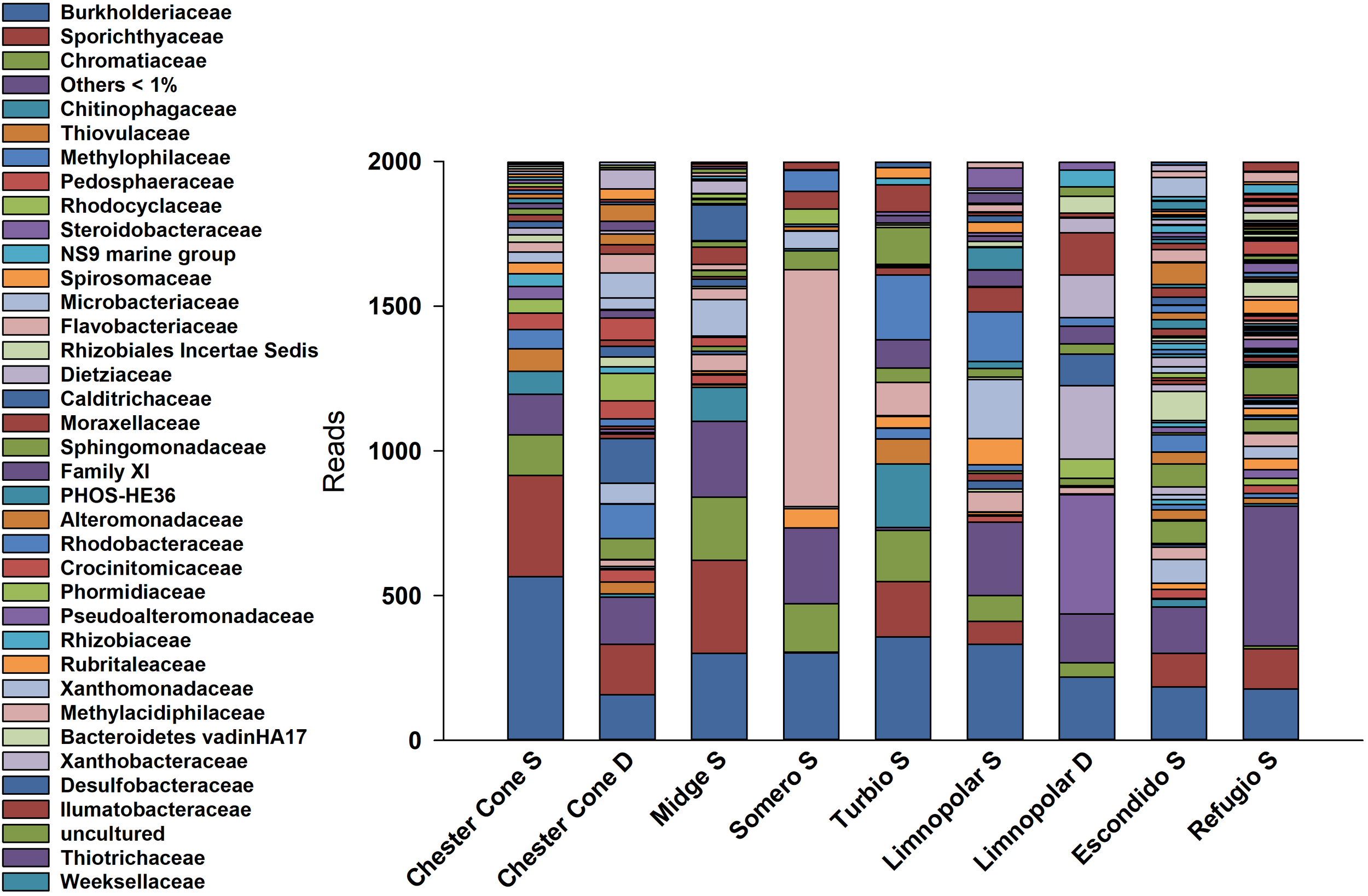 The vertical distribution of the bacterial community was assessed in lakes Limnopolar and Chester (Figure 7). No clear pattern was found on ZOTUs richness between depths (Table 2), as it was somewhat higher in the upper layer of Lake Limnopolar compared to the bottom, whereas in the Chester Cone Lake, where overall richness was almost double, the vertical pattern seemed to be the opposite. In both lakes, abundant families including cosmopolitan member such as Burkholderiaceae and Sporichthyaceae were rather uniformly distributed through the water column, but the distribution of other groups changed markedly with depth. Thus, in Lake Limnopolar, the families Xanthomonadaceae and Pseudomonadaceae were more abundant in the upper layer, whereas Steroidobacteraceae and Xanthobacteraceae concentrated in the bottom. Other families such as Alicyclobacillaceae, Thiotrichaceae, as well the cyanobacterial Leptolyngbyaceae and Phormidiaceae, also occurred particularly in the deeper layer of this lake, the latter probably associated to the benthic mosses. In addition, Proteobacterial families related to the sulfur cycle (i.e., Desulfobacteraceae and Desulfobulbaceae) were mainly retrieved from the bottom samples in both lakes, particularly in Lake Chester Cone. Also, in this lake, members of some families such as Sphingomonadaceae, Marinobacteraceae, Caulobacteraceae and Gallionellaceae dominated also in relative terms in the deepest sample. On the other hand, it was striking the occurrence in these two lakes of some anoxygenic microorganisms such as purple sulfur bacteria (Chromatiaceae) and Anaerolineaceae, the later belonging to the Chloroflexi phylum, which can also be associated to the specific conditions created within the moss carpets in the bottom samples.