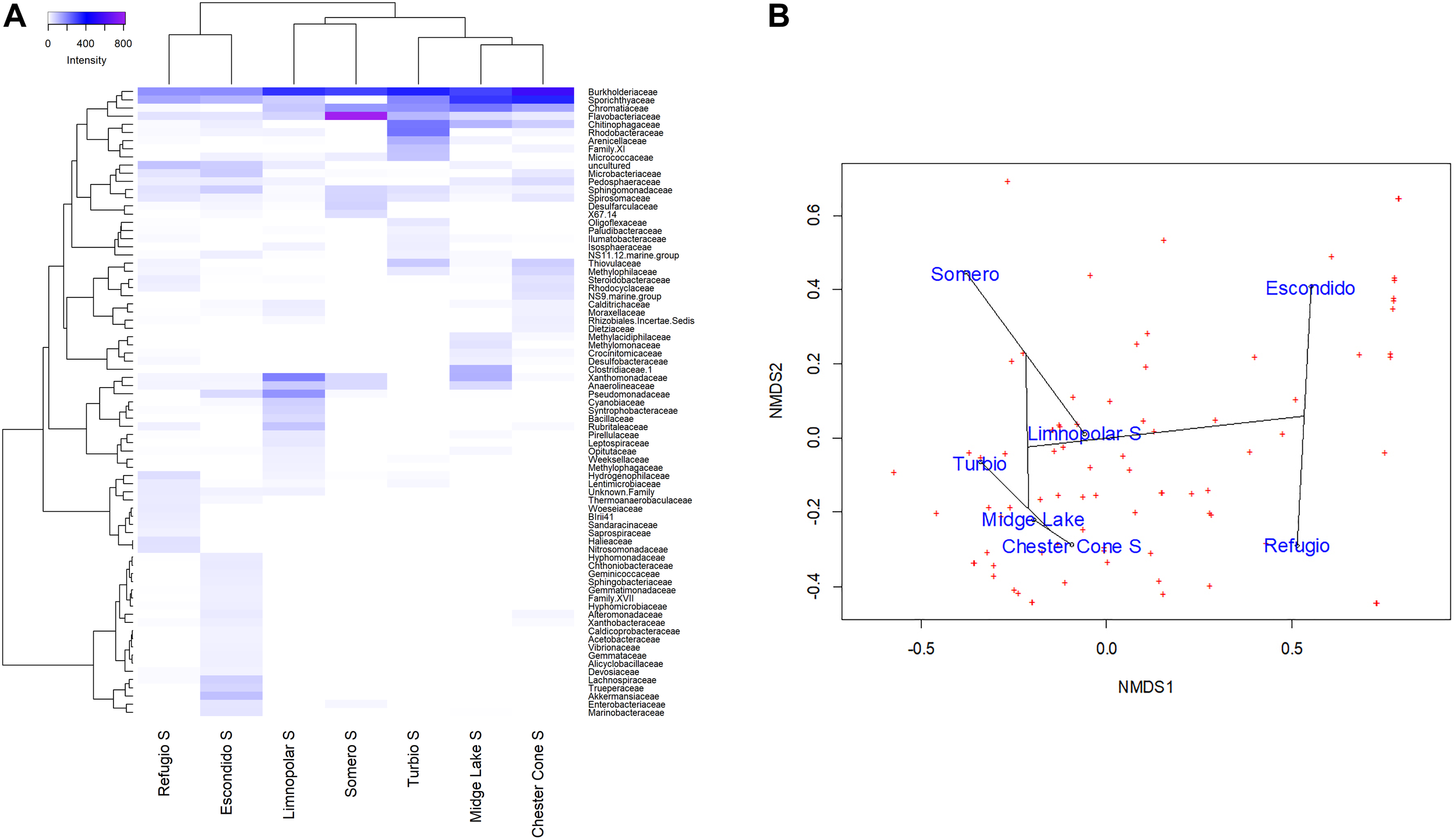 (A) Heatmap of two-way cluster analysis performed on the bacterioplankton community composition at family level (families with at least one sample with more than 1% in relative abundance) in the surface waters of the studied lakes. Both the taxa and the samples were clustered using Bray–Curtis dissimilarities. The color intensity in the cluster dendrogram correspond to the abundance of normalized reads. (B) A non-metric multidimensional scaling (NMDS) plot based on Bray–Curtis dissimilarity of bacterial taxonomic composition at family level (all families) across the studied lakes.